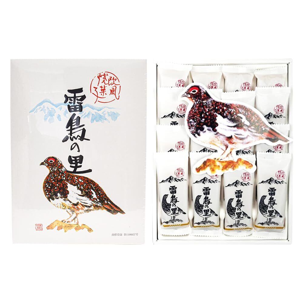 「『雷鳥の里』は、信州長野の自然が育んだ上質なウエハースです。16枚入りのパッケージは、いつでもどこでも手軽に楽しめるおやつとして、あなたのティータイムや家族の団らんを彩ります!」