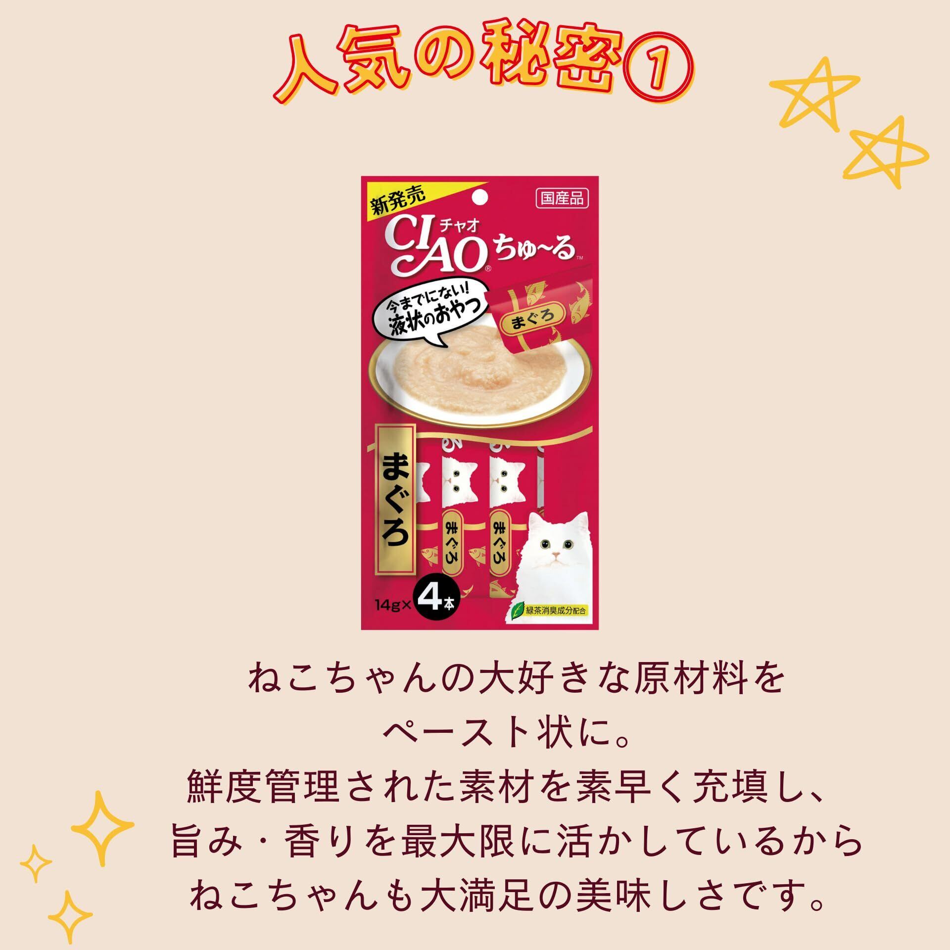 「『チャオ (CIAO) 旅するちゅ~る』は、愛猫が喜ぶ3種類のフレーバーを楽しめるおやつです。どのフレーバーも、豊かな旨みが詰まった汁だくのチュールタイプで、猫ちゃんの食いつきも抜群!日々のご褒美や特別な時にぴったりな一品です!」