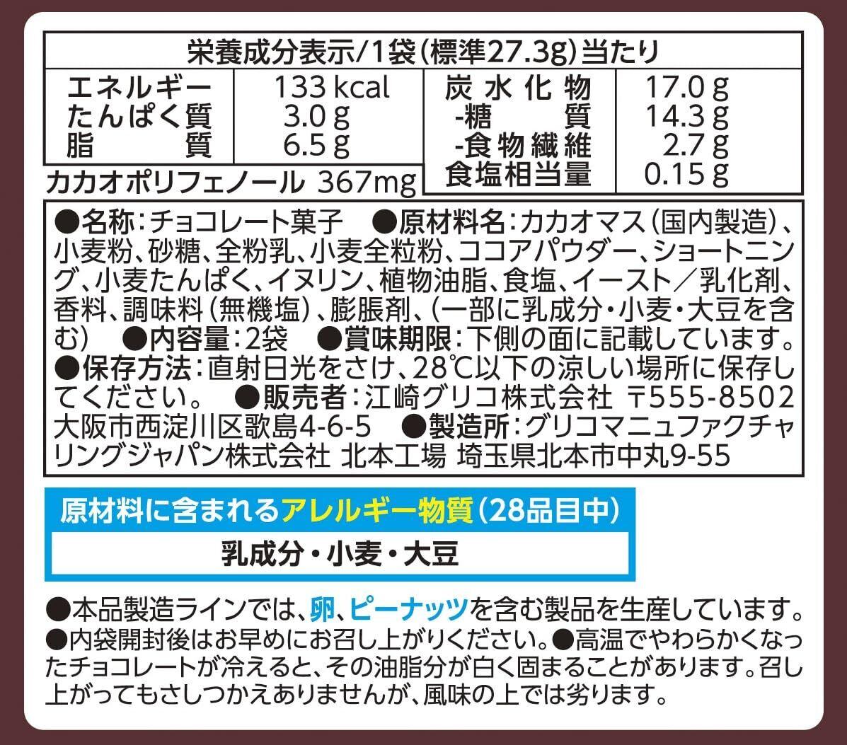 カカオマス(国内製造)、小麦粉、砂糖、全粉乳、小麦全粒粉、ココアパウダー、ショートニング、小麦たんぱく、イヌリン、植物油脂、食塩、イースト/乳化剤、香料、調味料(無機塩)、膨脹剤、(一部に乳成分・小麦・大豆を含む)