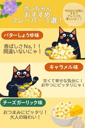電子レンジ・フライパンどちらでもOK! レンジなら約3分、フライパンでも5分以内で手軽に作れます。オイルや塩などを加えて、お好みのフレーバーにアレンジ自由!バター・キャラメル・カレー味など、カスタマイズ無限大です。