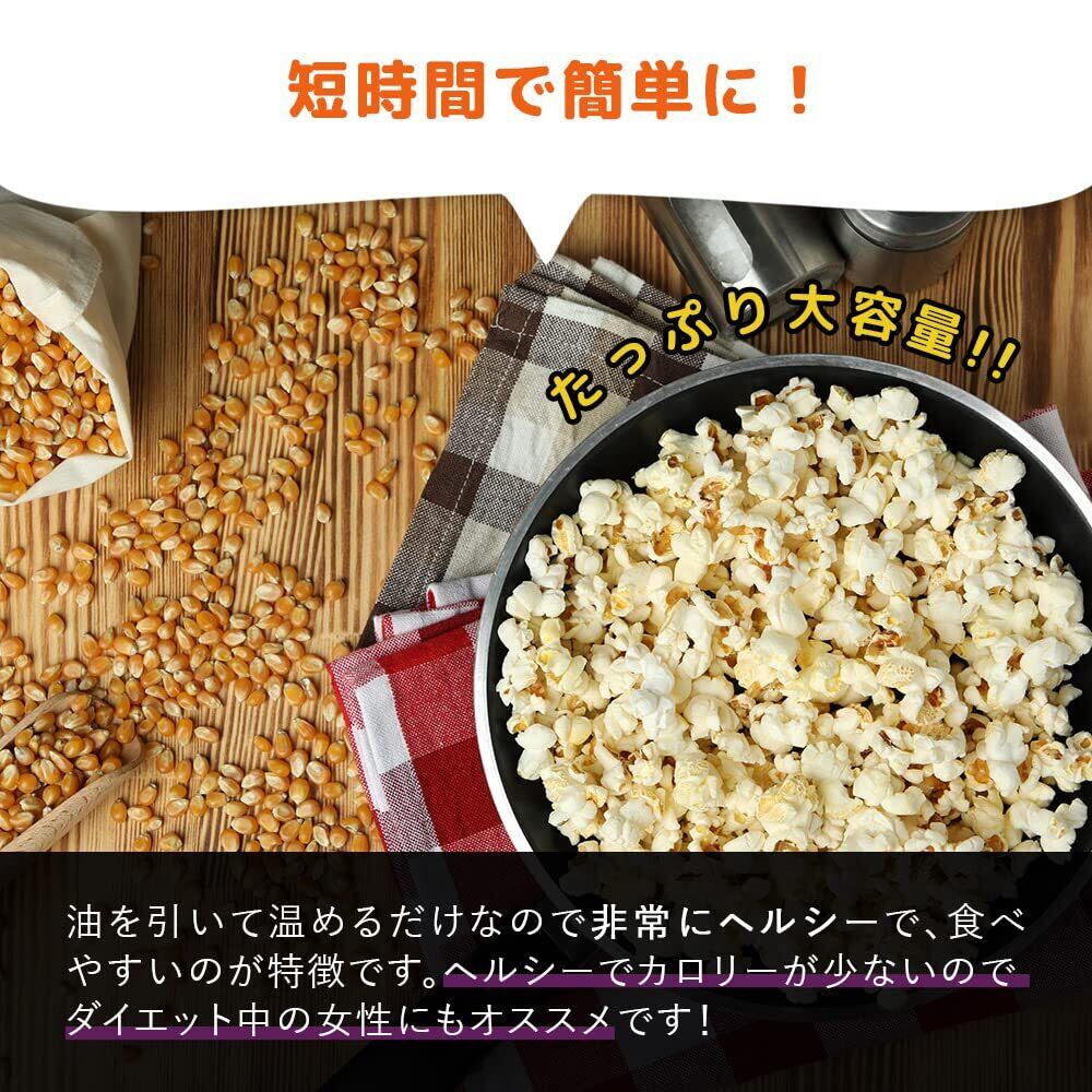 「電子レンジでもフライパンでも調理可能。たった数分で香ばしくはじけるポップコーンが出来上がります!オリジナルフレーバーのアレンジも自由自在。塩やバター、キャラメルなど、あなたの好みに合わせて楽しめます。」