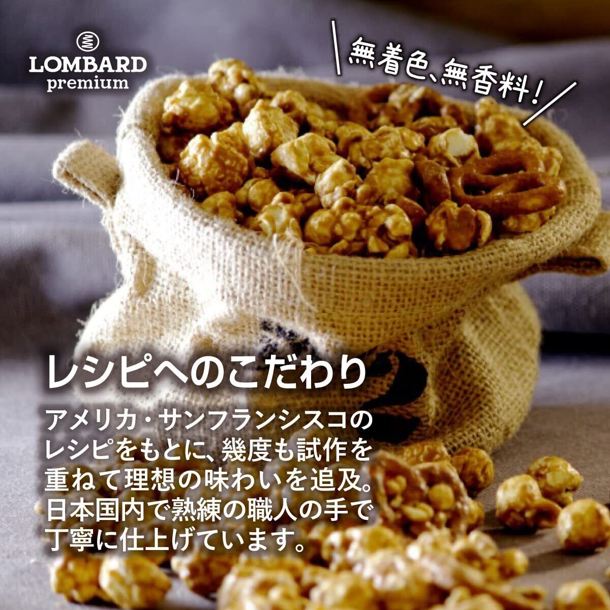 「『LOMBARD プレミアム ポップコーン キャラメル&プレッツェル 45g×6袋』は、国産の非遺伝子組換えコーンを使用した、贅沢な味わいのポップコーンです。甘くて香ばしいキャラメルと、サクサクのプレッツェルが絶妙にマッチした一品。おやつや映画のお供として、家族みんなで楽しめる美味しさです!」