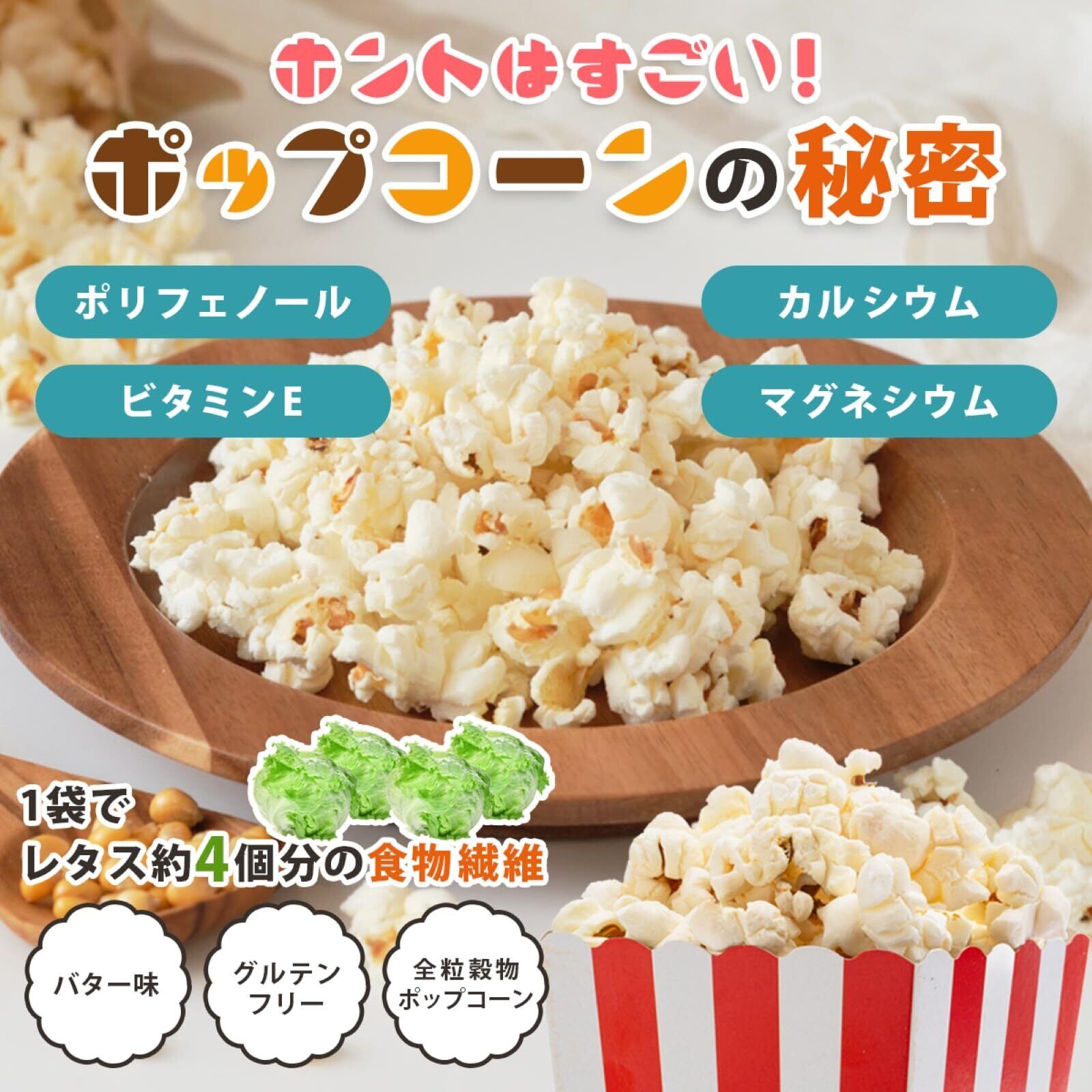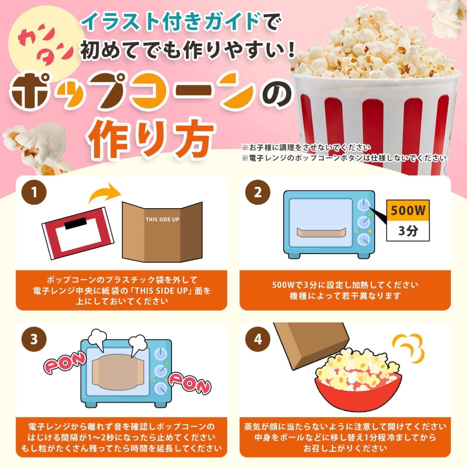 「ポンポンと楽しい音を立てるこのポップコーンで、お家時間がいつでも特別なイベントに変わります。たった3分で、映画鑑賞のお供にも、お子様のおやつにも、お酒のおつまみにも最適です。」