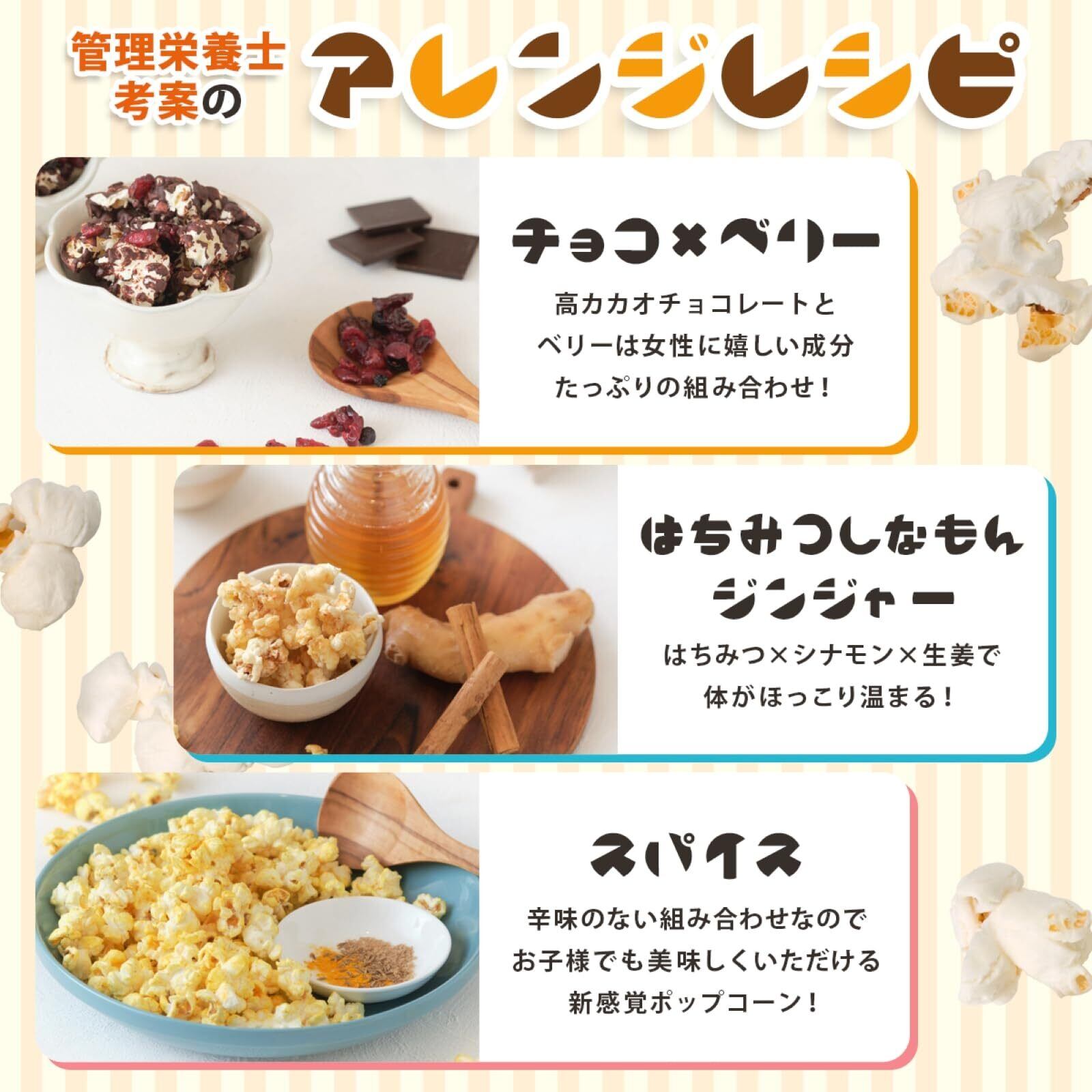 「レシピには楽しいイラストがついているので、お子様と一緒に作る際もわかりやすく、助かります。簡単な手順で、ポップコーンを作る楽しさを味わいながら、創造力を育むことができます。お好みでバターや塩、オリーブオイルなどを加えて、自分だけの特別なポップコーンを楽しめます!」
