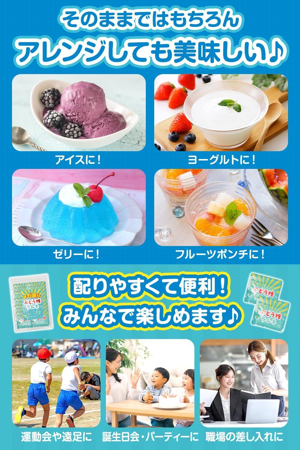 「このぶとう糖ラムネは、仕事や勉強のお供、おやつタイム、運動後のエネルギー補給、子供たちのお楽しみ会など、様々なシーンで大活躍!小分け包装されているため、持ち運びにも便利で、いつでも手軽に楽しめます。友達や家族との楽しい時間をすごしながら、元気の源をシェアしましょう!」