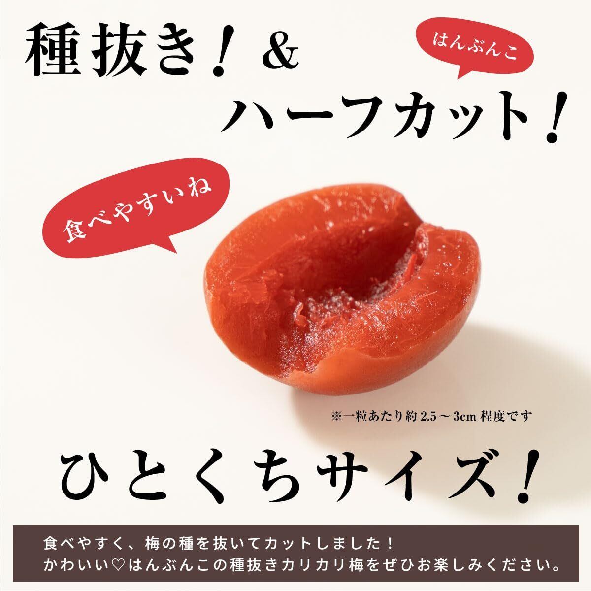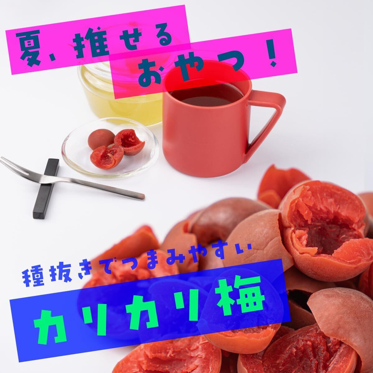 「この『カリカリ梅』は、自宅でのスナックとして、そしてお酒のおつまみとして大活躍!友人や家族との集まりやピクニックにも最適で、特別なひとときをさらに彩るアイテムです。また、健康を意識する方にも嬉しい低カロリーのおやつとして、日常に取り入れやすいのが魅力です!」