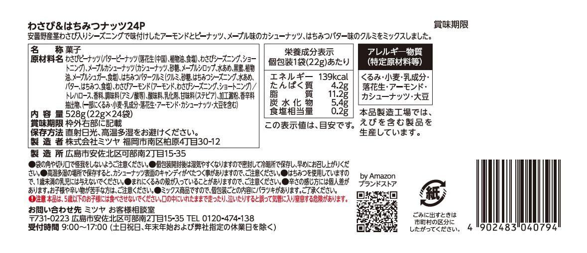 原材料:わさびピーナッツ(バターピーナッツ(落花生(中国)、植物油、食塩)、わさびシーズニング、ショートニング)、メープルカシューナッツ(カシューナッツ、砂糖、メープルシロップ、水あめ、黒蜜、植物油、メープルシュガー、食塩)、はちみつバタークルミ(クルミ、砂糖、はちみつシーズニング、水あめ、バター、はちみつ、食塩)、わさびアーモンド(アーモンド、わさびシーズニング、ショートニング)/トレハロース、香料、調味料(アミノ酸等)、酸味料、乳化剤、甘味料(ステビア)、加工澱粉、香辛料抽出物、(一部にくるみ・小麦・乳成分・落花生・アーモンド・カシューナッツ・大豆を含む)