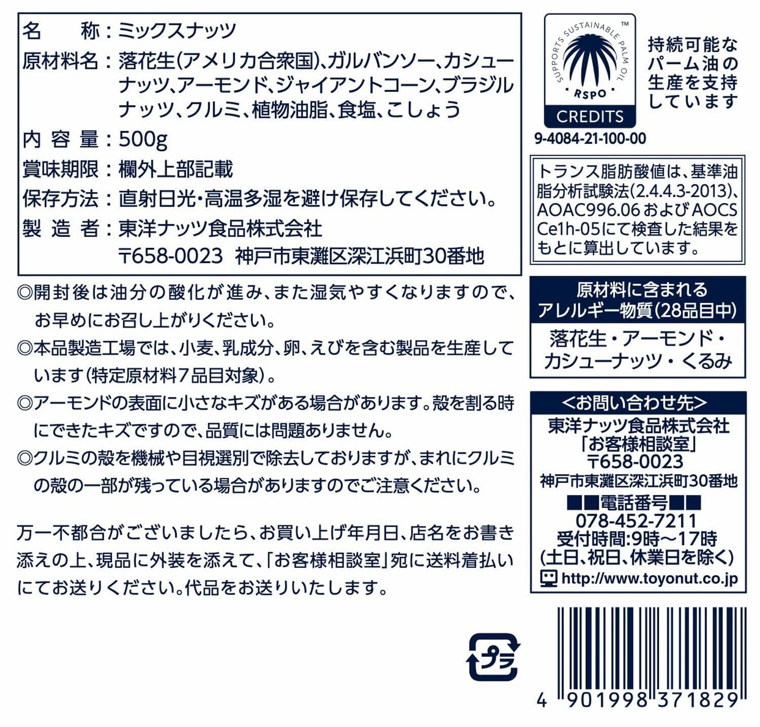 原材料:落花生(アメリカ産)、ガルバンソー、カシューナッツ、アーモンド、とうもろこし、ブラジルナッツ、クルミ、植物油脂、食塩、白こしょう、調味料(アミノ酸等)