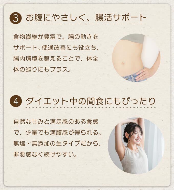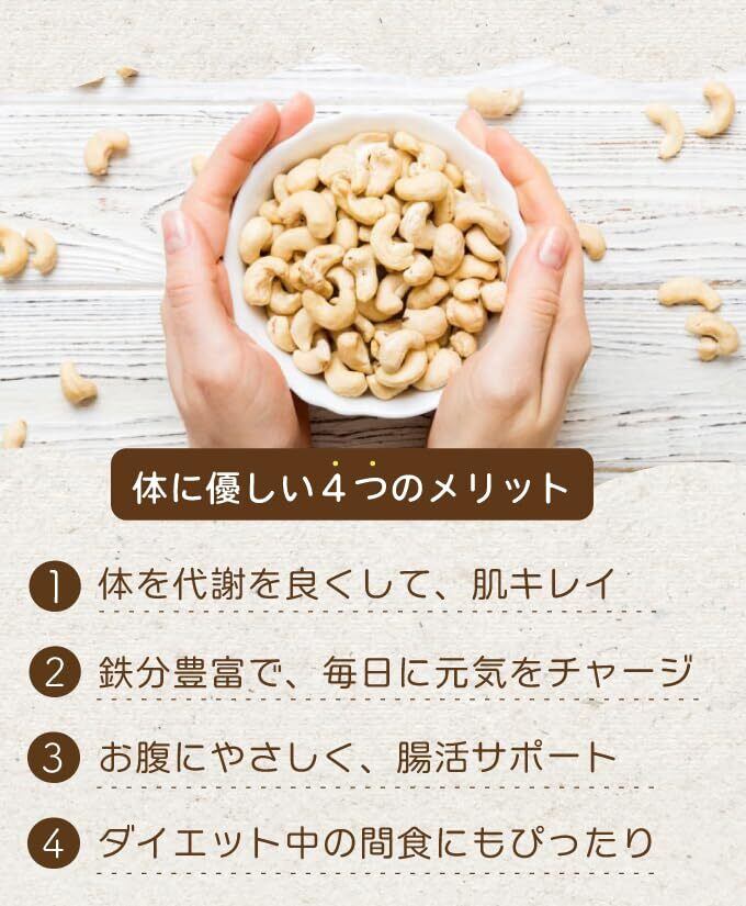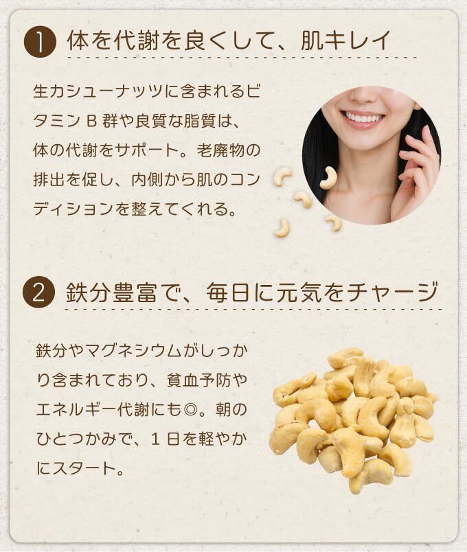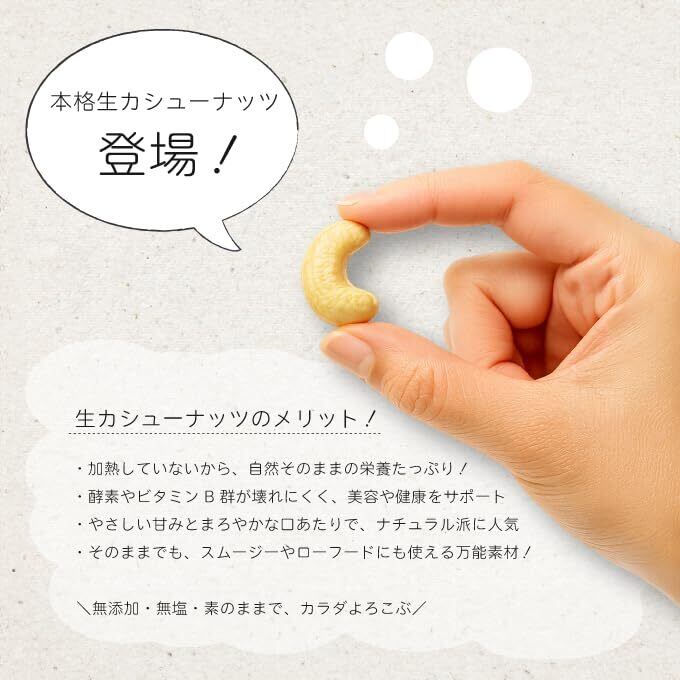 「本商品は、手間をかけて選別された生のカシューナッツを使用しており、添加物を一切使用していません。安心して食べることができ、自然の味わいをそのまま楽しめるスナックです。」