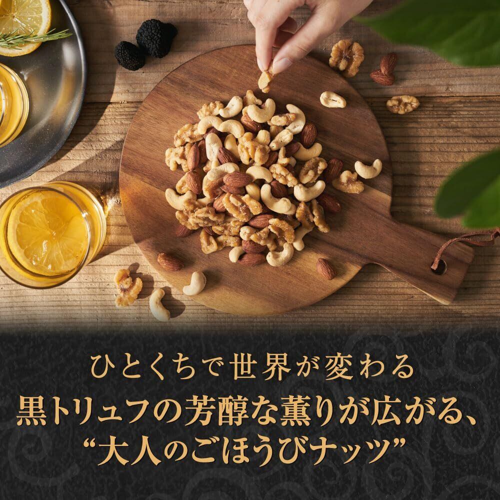 「本商品は、厳選されたナッツを使用しており、黒トリュフの芳醇な香りが広がります。独自の製法により、ナッツの食感と風味がバランスよく保たれており、お酒のお供やおやつにぴったりです。」