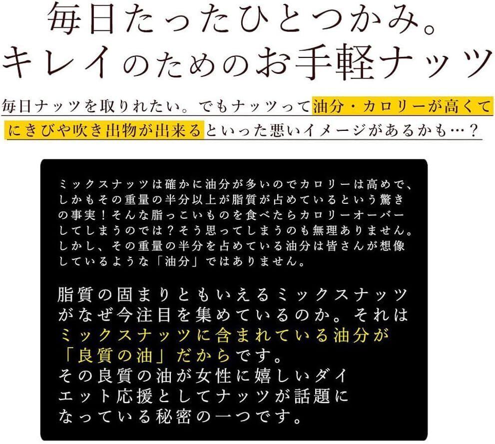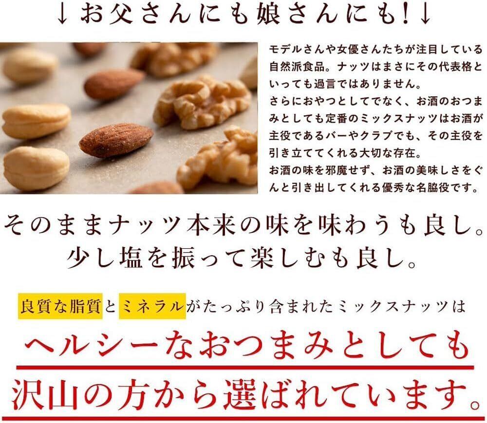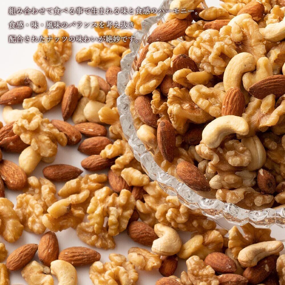 「本商品は、厳選されたナッツを使用しており、添加物が一切入っていないので、安心して楽しめるおやつです。生くるみの濃厚な味わい、素焼きアーモンドの香ばしさ、素焼きカシューナッツのクリーミーさが見事に融合し、食べる手が止まらなくなります。」