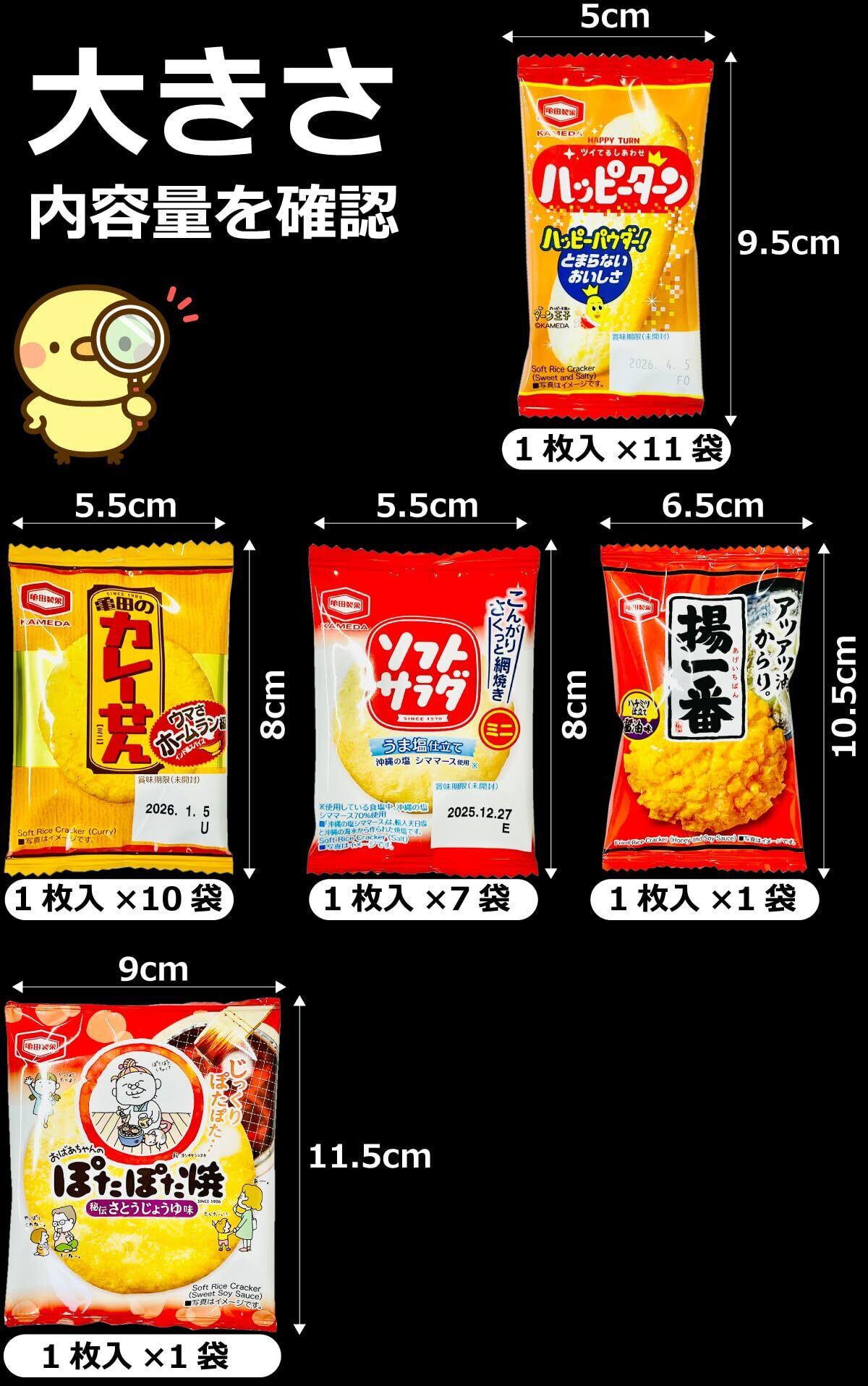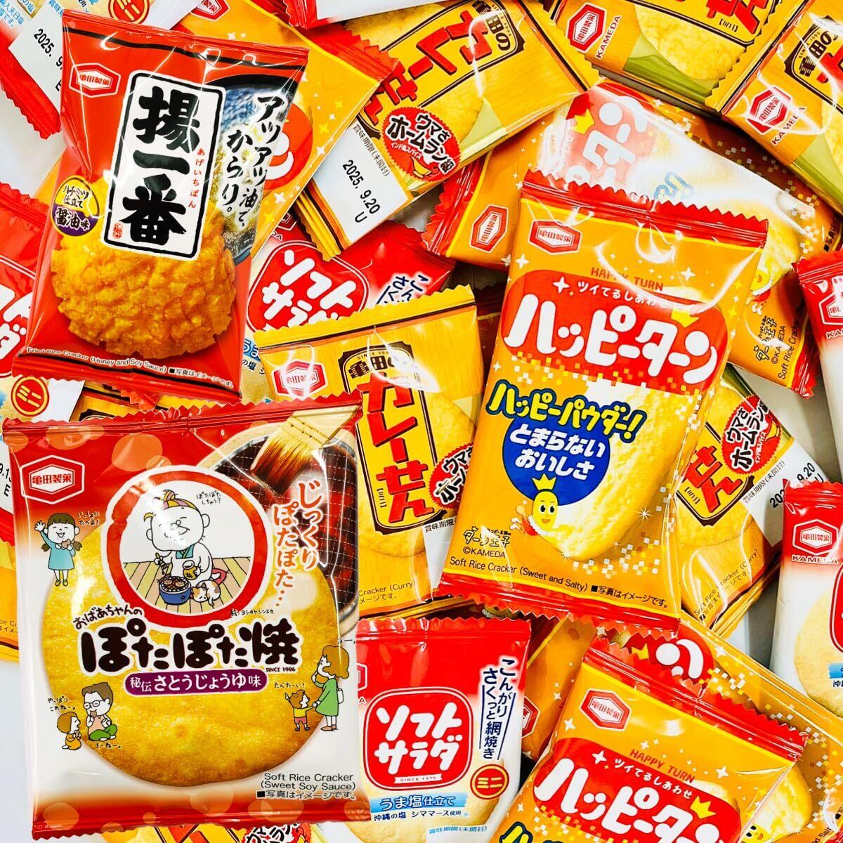 スーパーやドラックストアでは手に入らない「業務用 小袋サイズ」。亀田製菓「ハッピーターン」や「カレーせん」「ぽたぽた焼」などをギュっと詰め込みました!