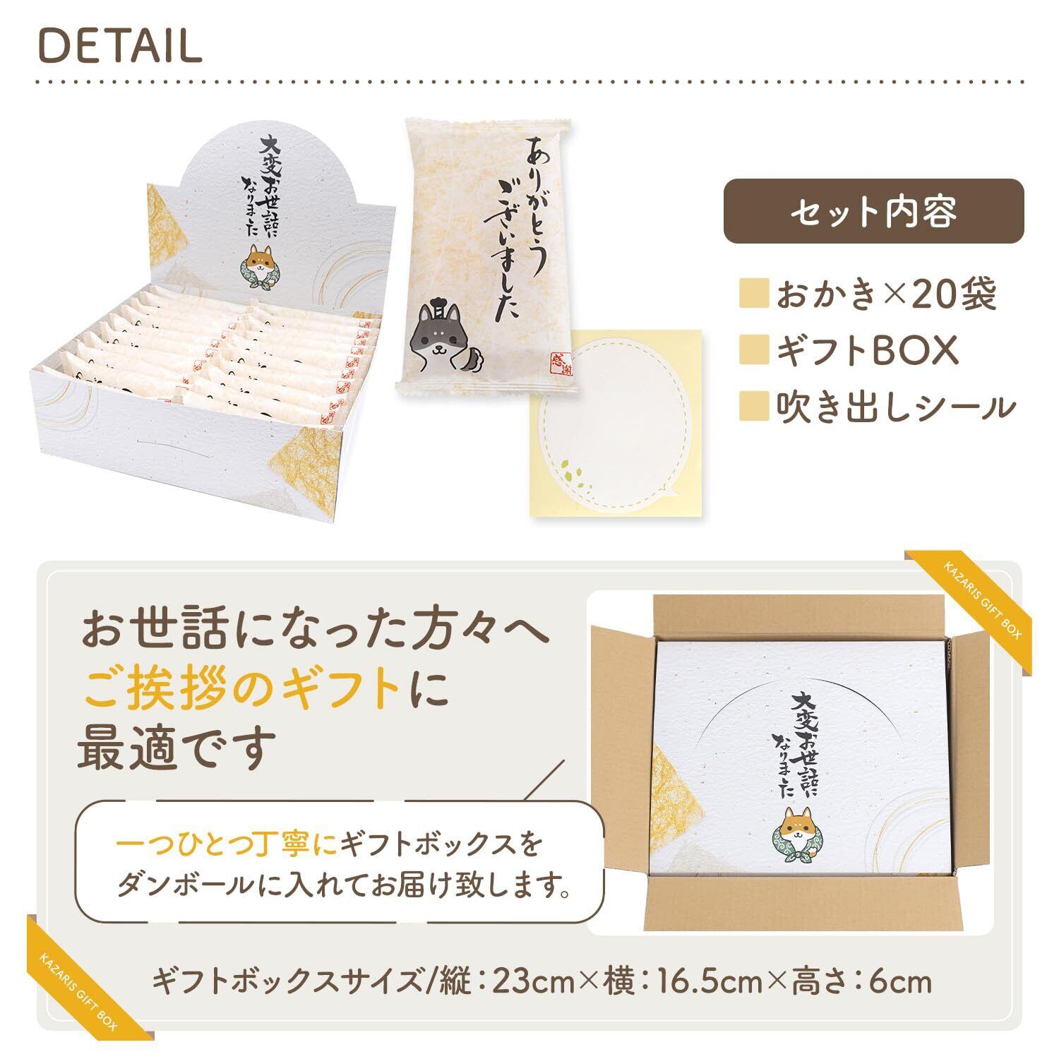 【 商品詳細 】〇サイズ:〈ギフトBOX〉26×23×9.5(cm) 〇セット内容:おかき個装袋×20個、ギフトBOX、吹き出しシール 〇ブランド:KAZARIS(カザリス)