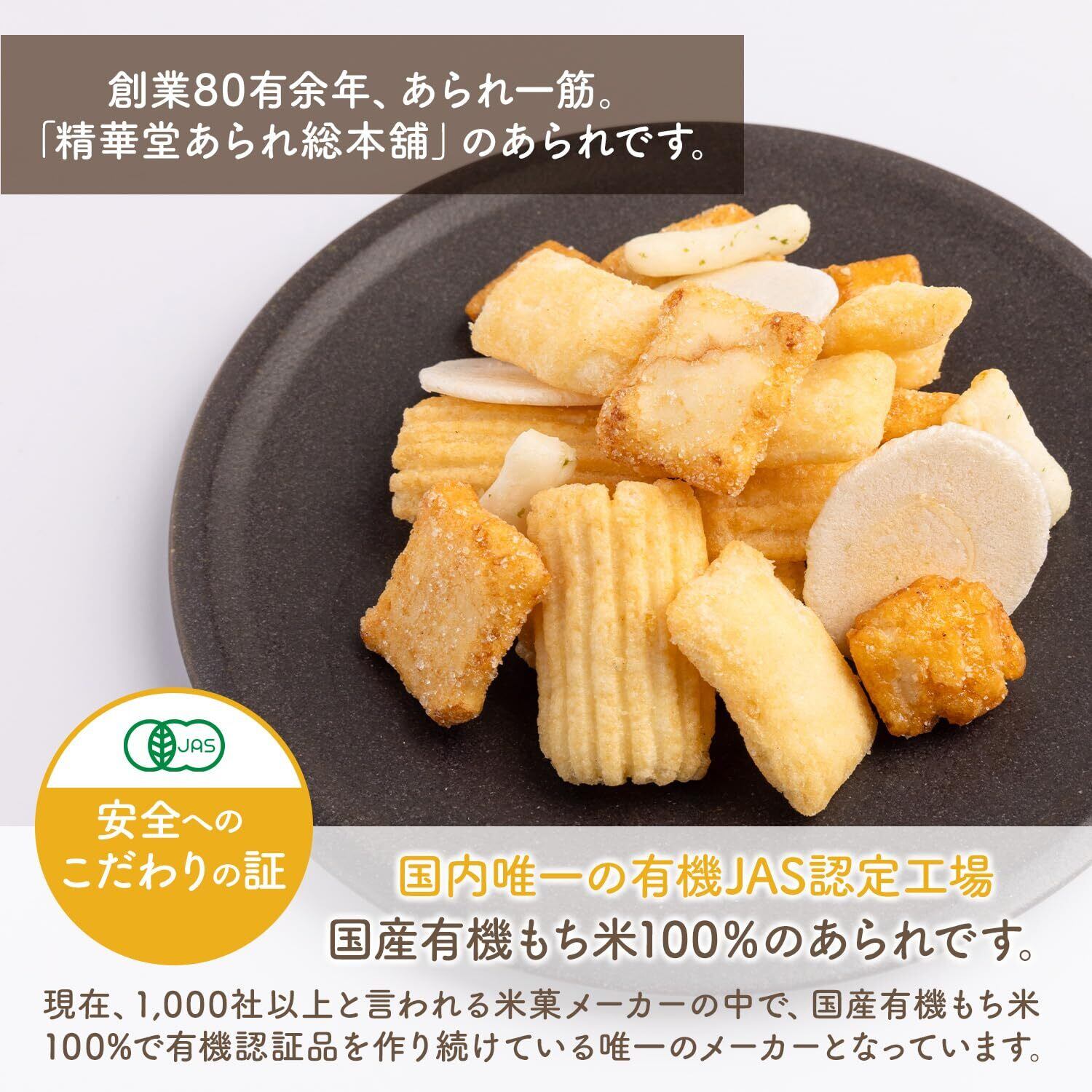 【 国産有機もち米100%のあられ 】創業80有余年、あられ一筋「精華堂あられ総本舗」のあられです。現在1000社以上と言われる米菓メーカーの中で、国産有機もち米100%で有機認証品を作り続けている唯一のメーカーです。