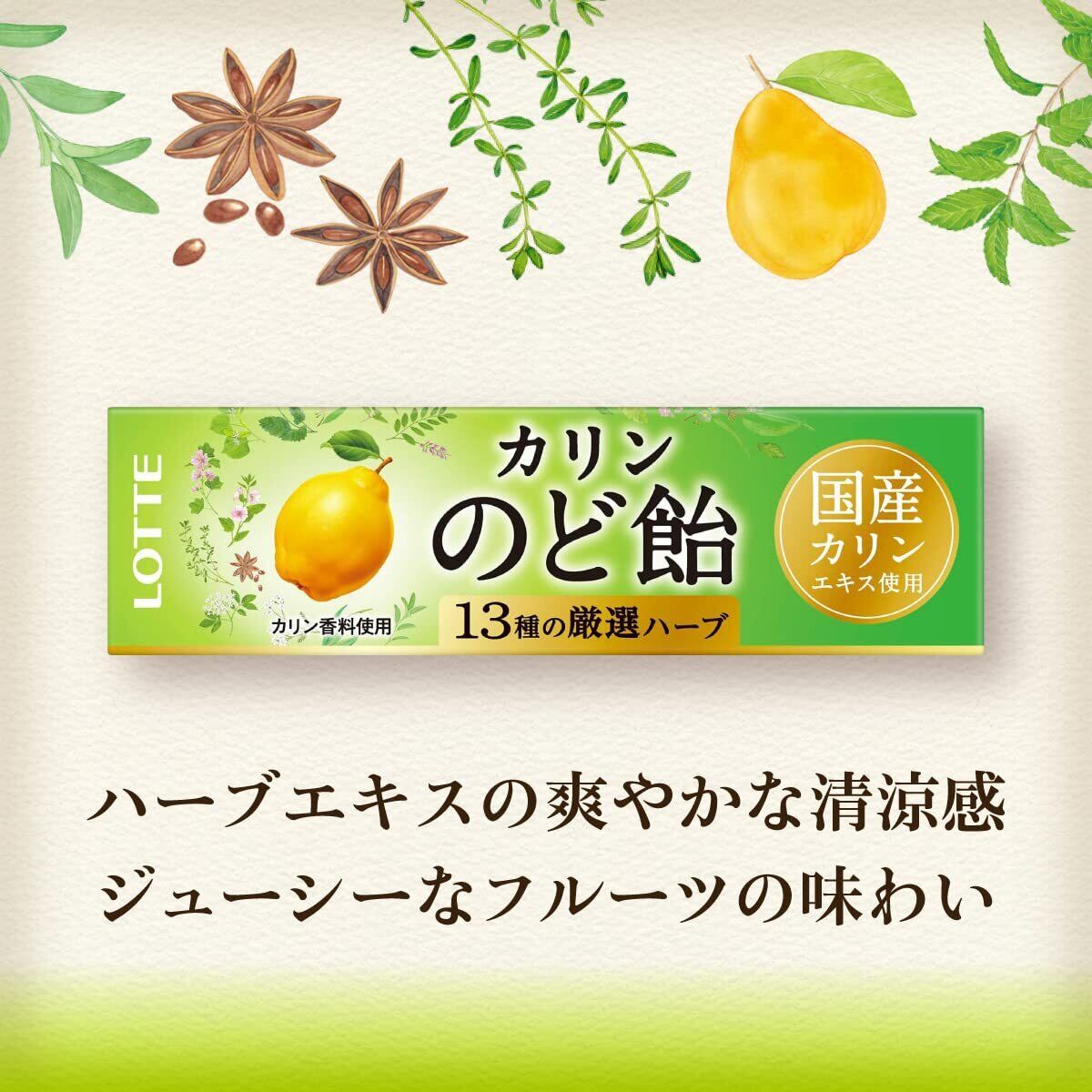 原材料:砂糖、水あめ、ハーブエキス、濃縮カリン果汁、モルトエキス、カリンエキス、香料、カラメル色素、乳化剤、調味料(アミノ酸)、(原材料の一部に大豆を含む)