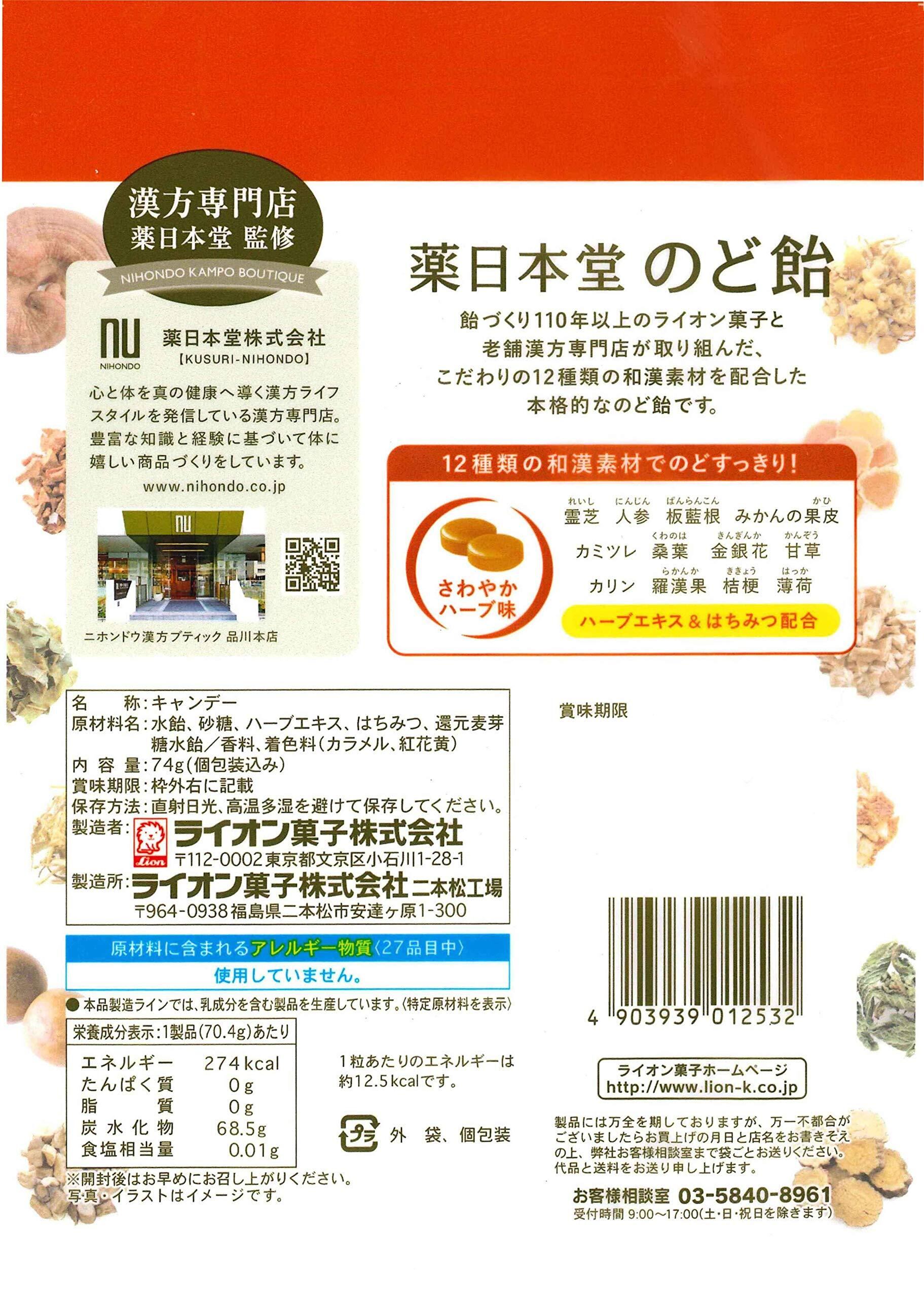 **\ライオン菓子 薬日本堂のど飴 74g×6袋!のどに優しい、心地よい味わいの飴です!/**