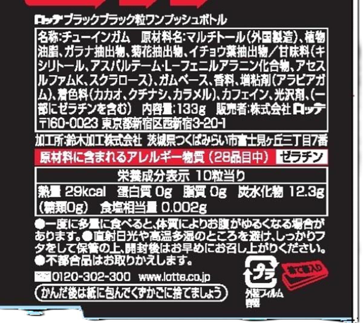 <ブラックブラック>マルチトール(外国製造)、植物油脂、ガラナ抽出物、菊花抽出物、イチョウ葉抽出物/甘味料(キシリトール、アスパルテーム・L-フェニルアラニン化合物、アセスルファムK、スクラロース)、ガムベース、香料、増粘剤(アラビアガム)、着色料(カカオ、クチナシ、カラメル)、カフェイン、光沢剤、(一部にゼラチンを含む) <大粒>マルチトール(外国製造)、エリスリトール、還元パラチノース、植物油脂、ガラナ抽出物、菊花抽出物、イチョウ葉抽出物/ガムベース、香料、増粘剤(アラビアガム)、着色料(カカオ、クチナシ、カラメル)、カフェイン、甘味料(キシリトール、アスパルテーム・L-フェニルアラニン化合物、アセスルファムK)、光沢剤、(一部にゼラチンを含む)
