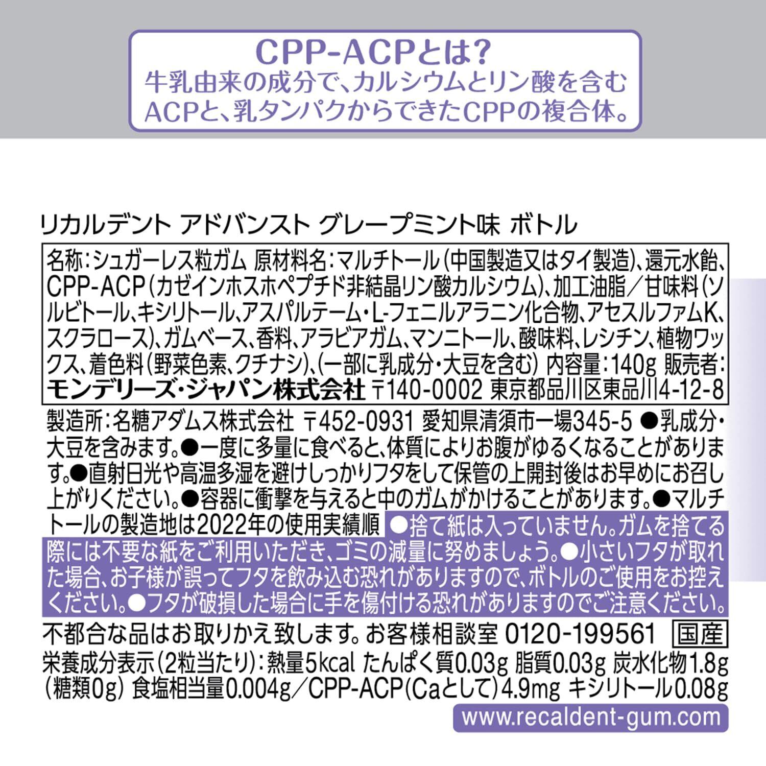 グレープミント(後味スッキリのグレープ味) 牛乳たんぱく質から作られた天然由来成分。 CPP-ACP(リカルデント)は、メルボルン大学のレイノルズ教授らのグループによって開発された、 牛乳由来たんぱく質の分解物であるカゼインホスホペプチド(CPP)と、非結晶性リン酸カルシウム(ACP)の複合体です。 CPP-ACPは生体が利用可能なカルシウムとリンを過飽和状態(高濃度)で口腔内に供給してくれます。