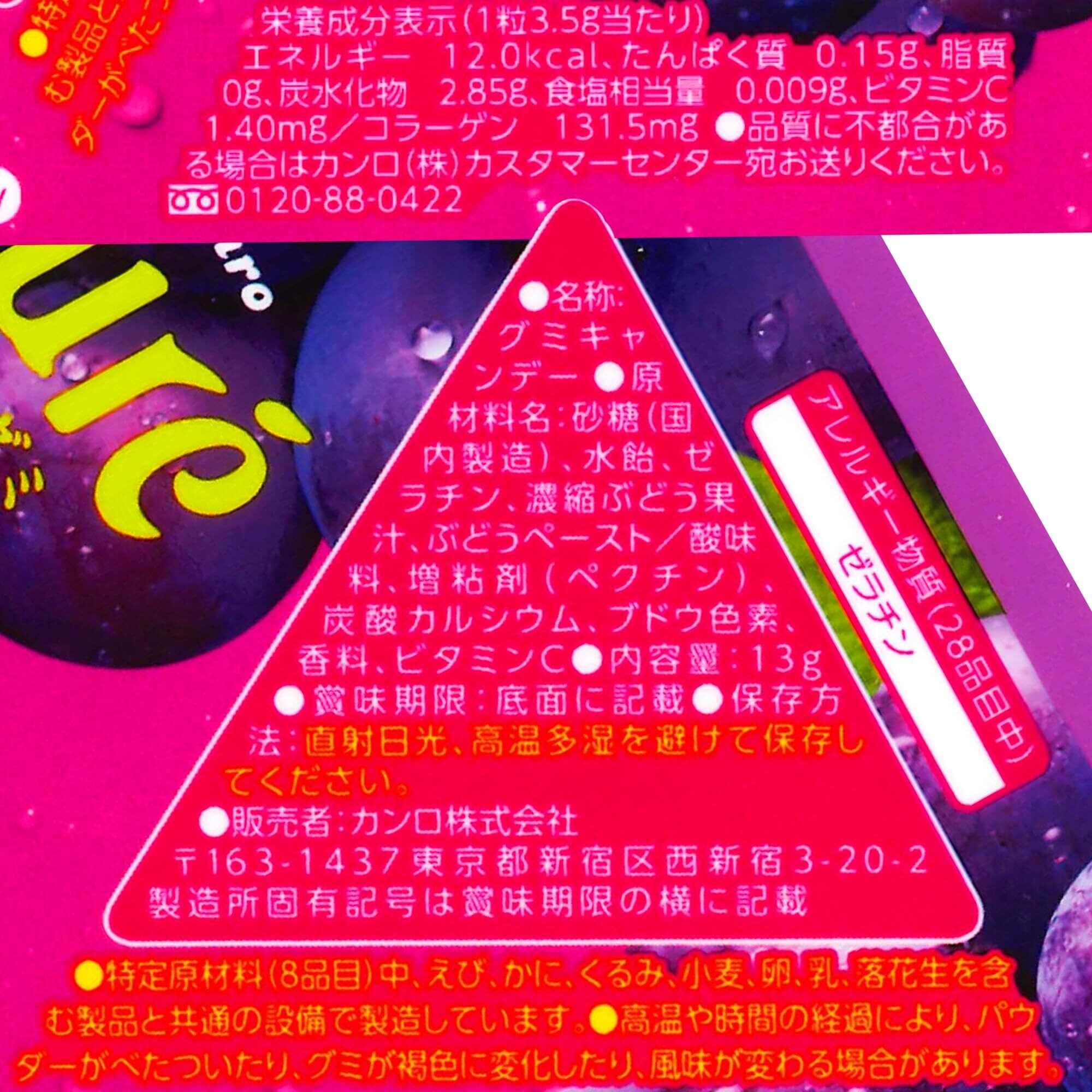 砂糖(国内製造)、水飴、ゼラチン、濃縮ぶどう果汁、ぶどうペースト/酸味料、増粘剤(ペクチン)、炭酸カルシウム、ブドウ色素、香料、ビタミンC