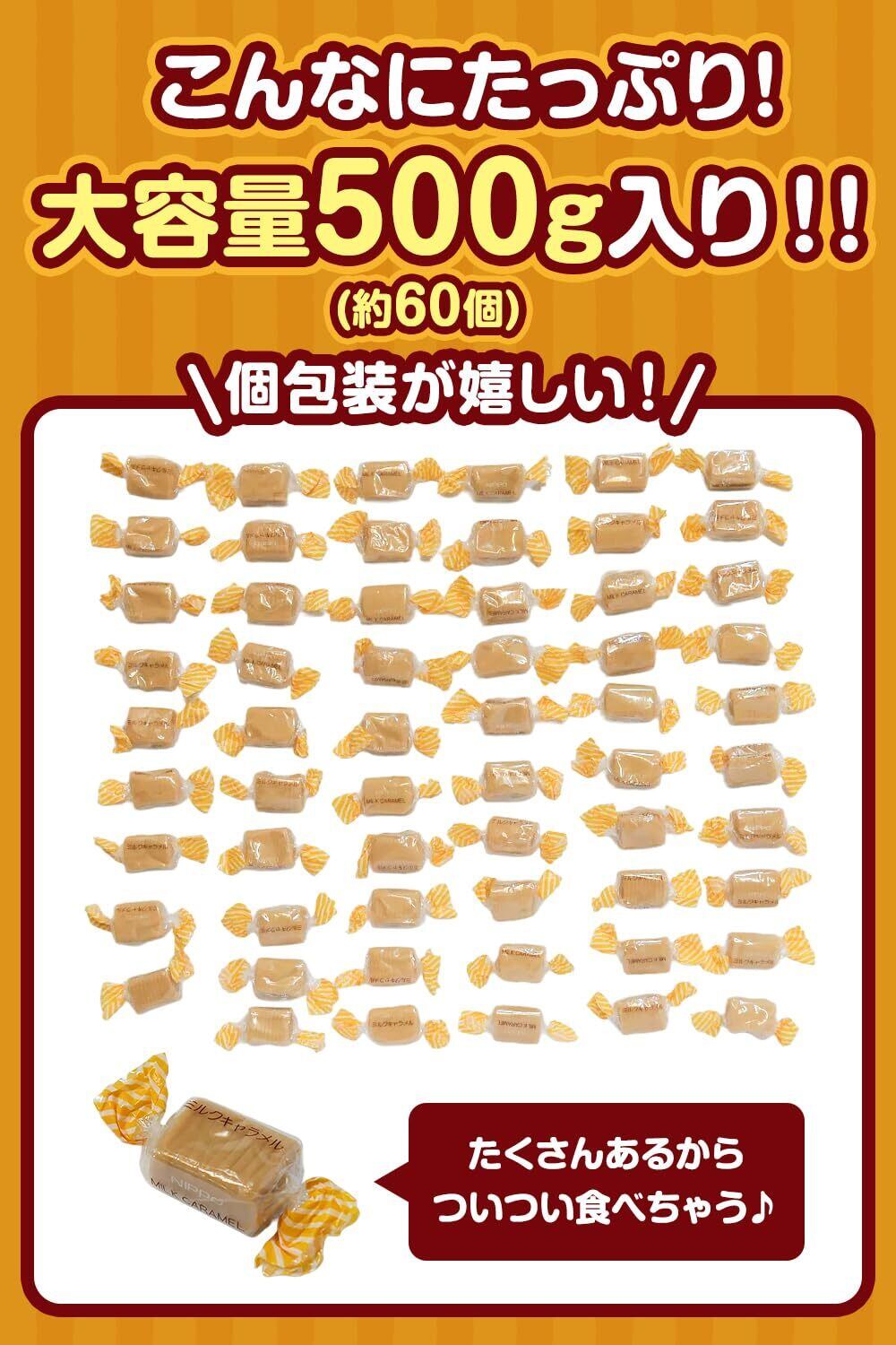 「500gの大容量は、友達や家族とシェアしやすく、パーティーやイベントにぴったりです。可愛らしい個包装は、目を引き、楽しい時間を演出します。色々なシーンで楽しめるキャラメルをぜひご堪能ください!」
