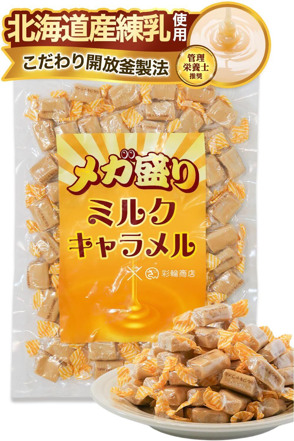 「『彩輪商店 キャラメル メガ盛り』は、国産の素材を使用したミルクキャラメルです。老舗メーカーの監修のもと、昔ながらの懐かしい味を守りつつ、良質なミルクをふんだんに使用し、深いコクと優しい甘みが口の中に広がります。個包装されたキャラメルは、いつでもどこでも気軽に楽しめるので、おやつタイムやリフレッシュに最適です!」