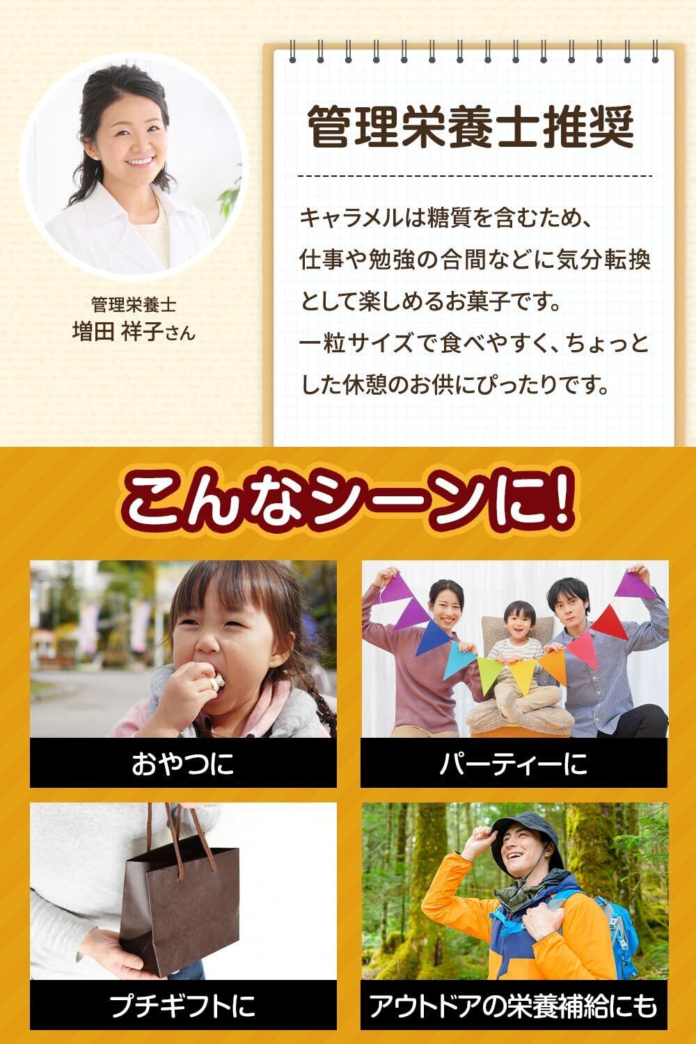 【管理栄養士推奨】キャラメルは糖質を含むため、仕事や勉強の合間などに気分転換として楽しめるお菓子です。一粒サイズで食べやすく、ちょっとした休憩のお供にぴったりです。