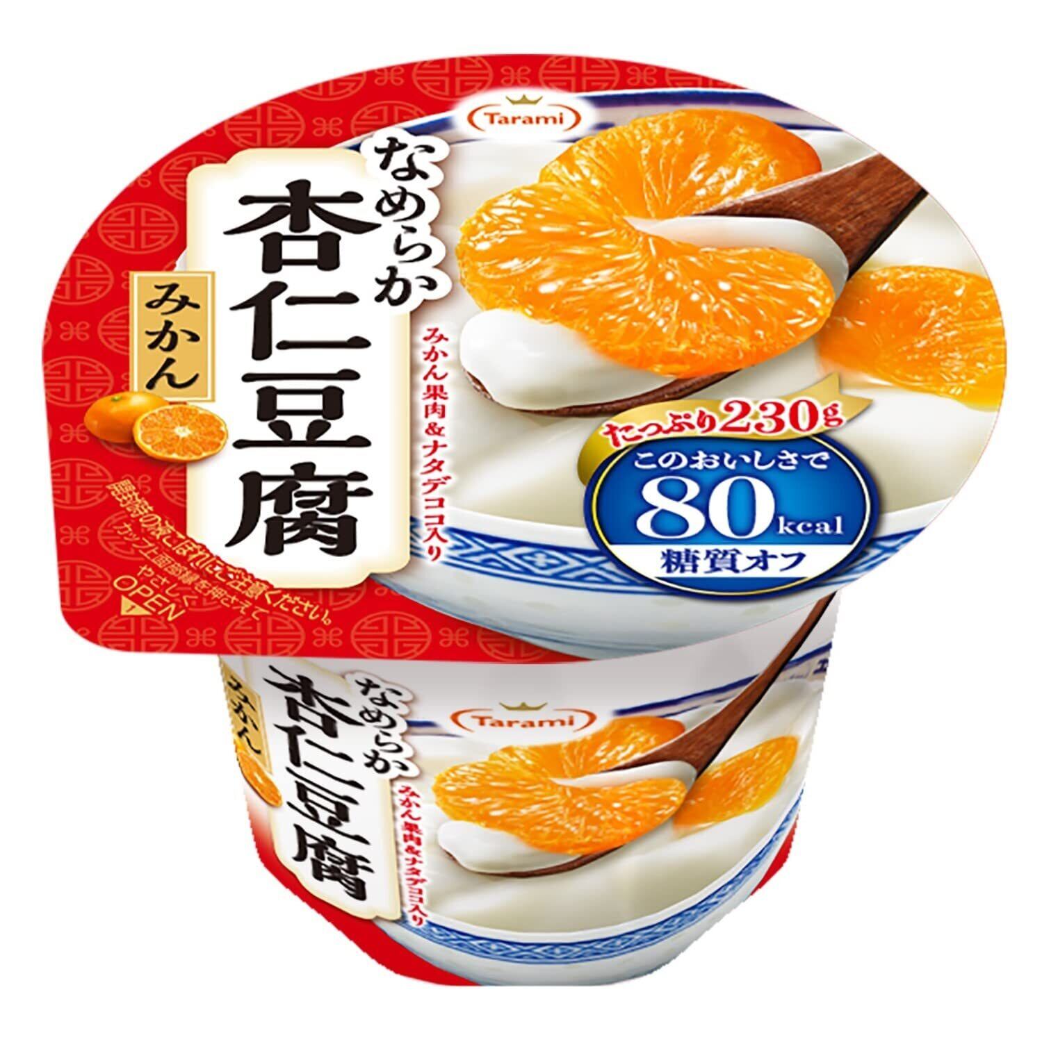 「『たらみ なめらか杏仁豆腐 みかん』は、口当たりの良い杏仁豆腐に、さわやかなみかん果肉が楽しめる230gのパウチが6個セットになった商品です。80kcalという低カロリーでありながら、クリーミーでリッチな味わいが特徴。デザートやおやつにぴったりな一品で、心地よい甘さを堪能できます!」