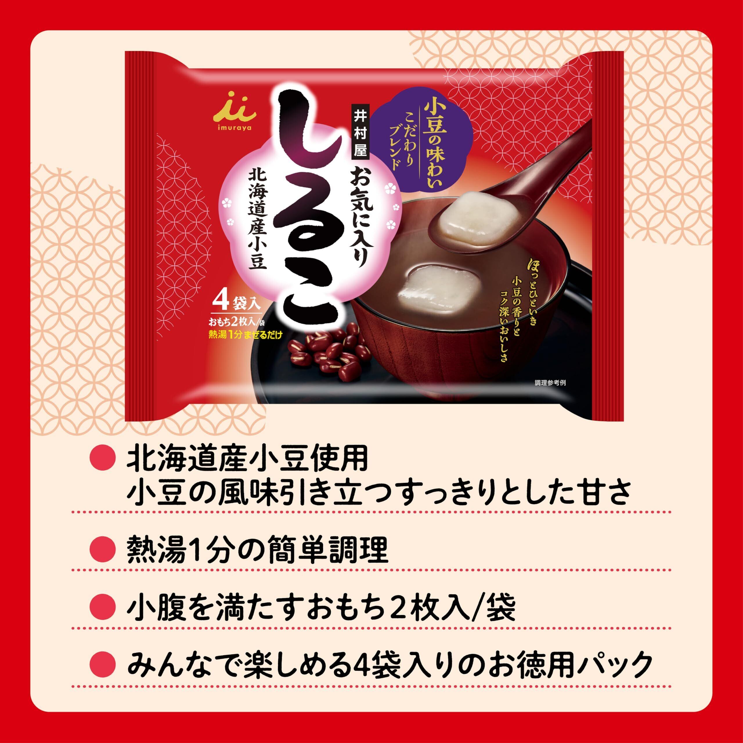 「『井村屋 お気に入りしるこ』は、136g(34g×4袋)が6袋セットとなった、心温まるおしるこです。こしあん仕立てで、上品な甘さとともにしっかりとした豆の風味を楽しむことができます。寒い日や疲れたときに、一杯のおしるこが心と体を癒してくれる一品です!」