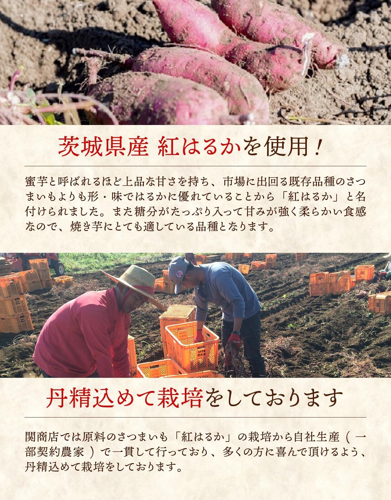 茨城県産の紅はるかを使用! 関商店の平干し芋です。 蜜芋と呼ばれるほど上品な甘さを持ち、市場に出回るサツマイモよりもはるかに優れていることから、「紅はるか」という名前が付けられました。 糖分がたっぷり入って甘みが強く、柔らかい食感なので干し芋にとても向いている品種となります。