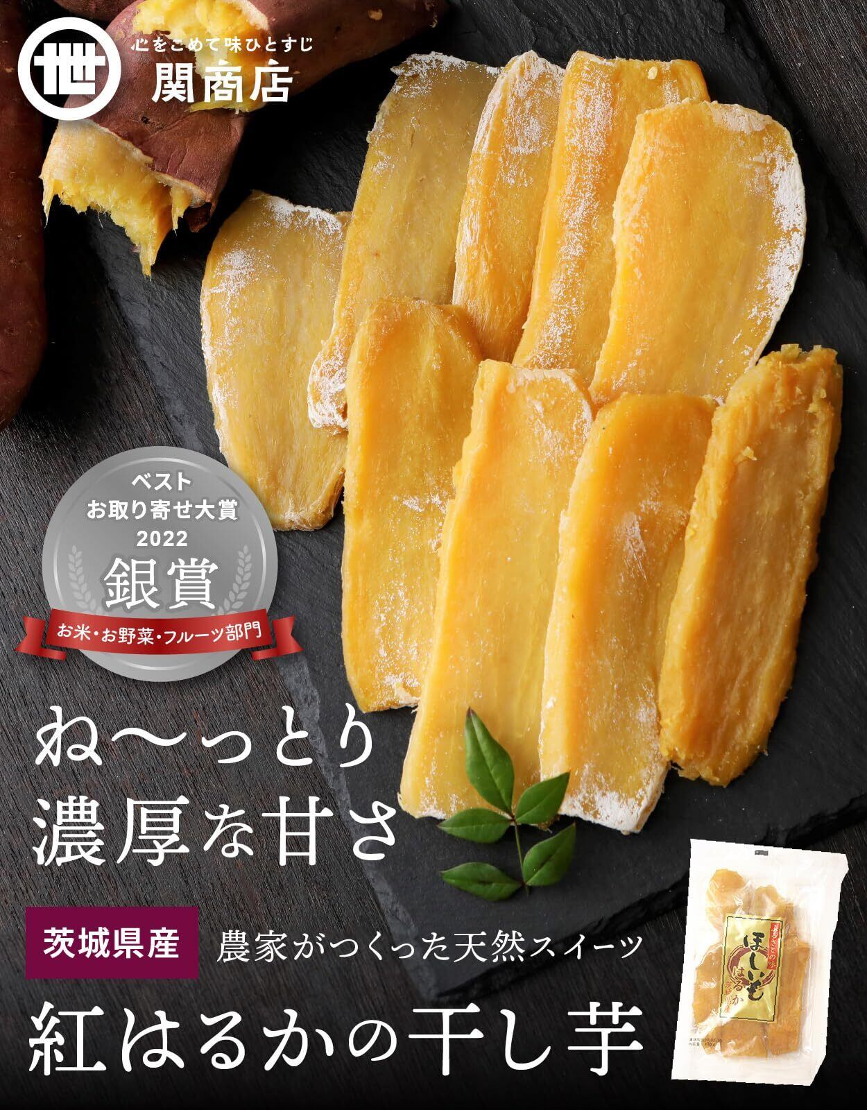 「『関商店 干し芋』は、300g入りのパックが3袋セットでお届けする、無添加で安全な平干しの干しいもです。厳選された国産の紅はるかを使用し、素材本来の甘みと風味を大切にしています。手間ひまかけて作られたこの干しいもは、家庭のおやつとしても、大切な方への贈り物としても最適です!」