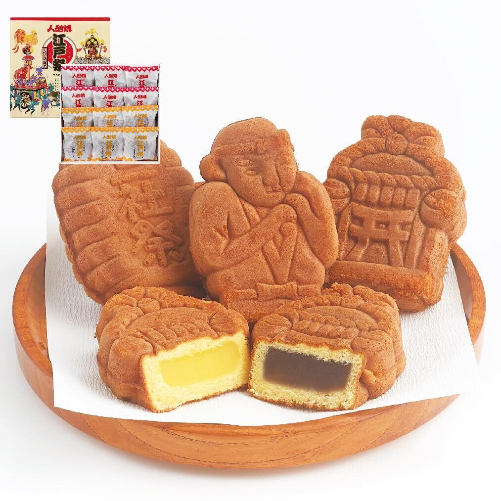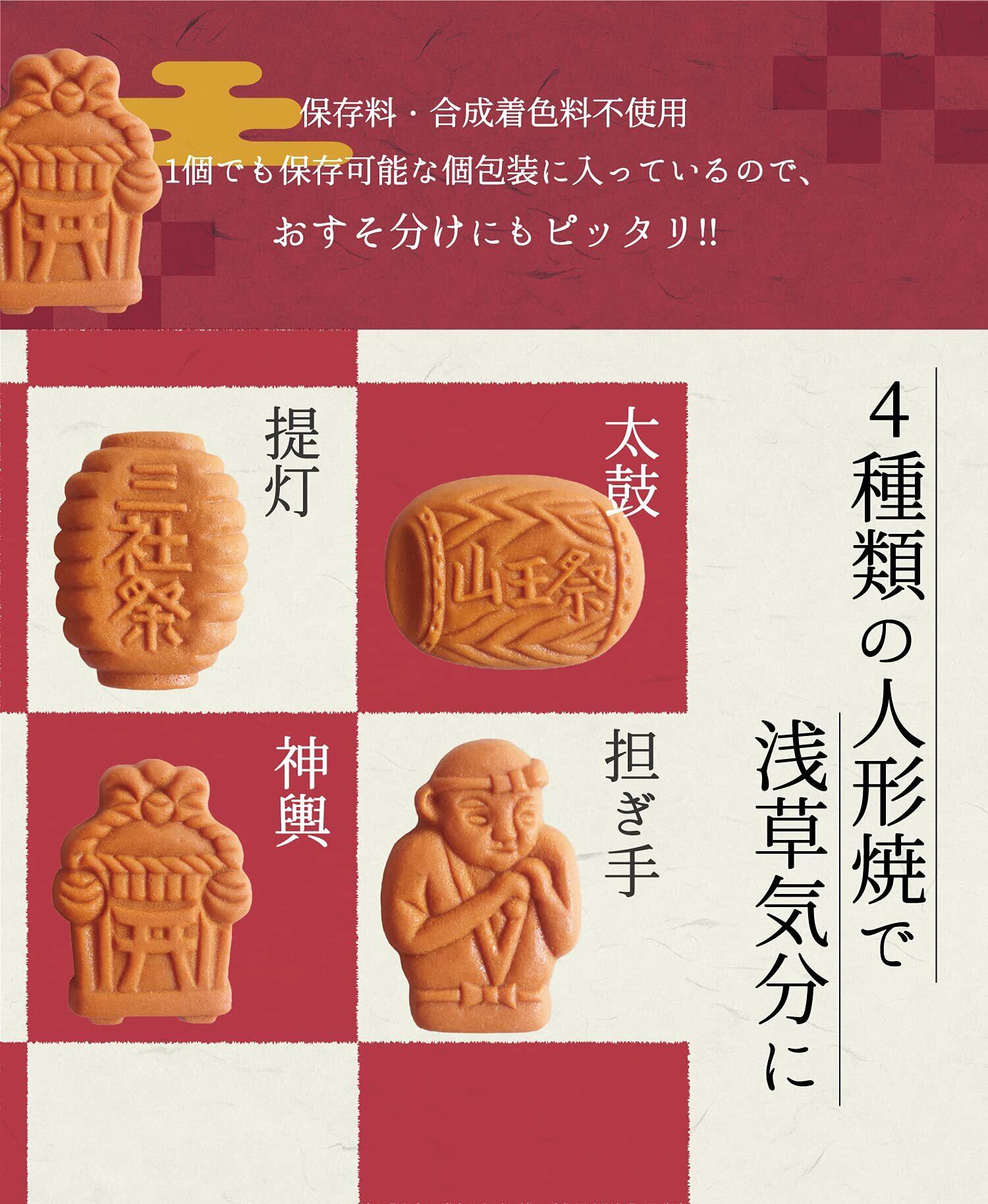 東京の象徴でもあるお祭りを型どった人形焼。しっとりとしたカステラ風味の生地で江戸祭専用に炊いた、なめらかなこしあんと良質なカスタードを包み、焼き上げました。ぜひ味わってください。保存料・合成着色料不使用で、1個でも保存可能な一個分け包装に入っているので、おすそ分けにもピッタリです。