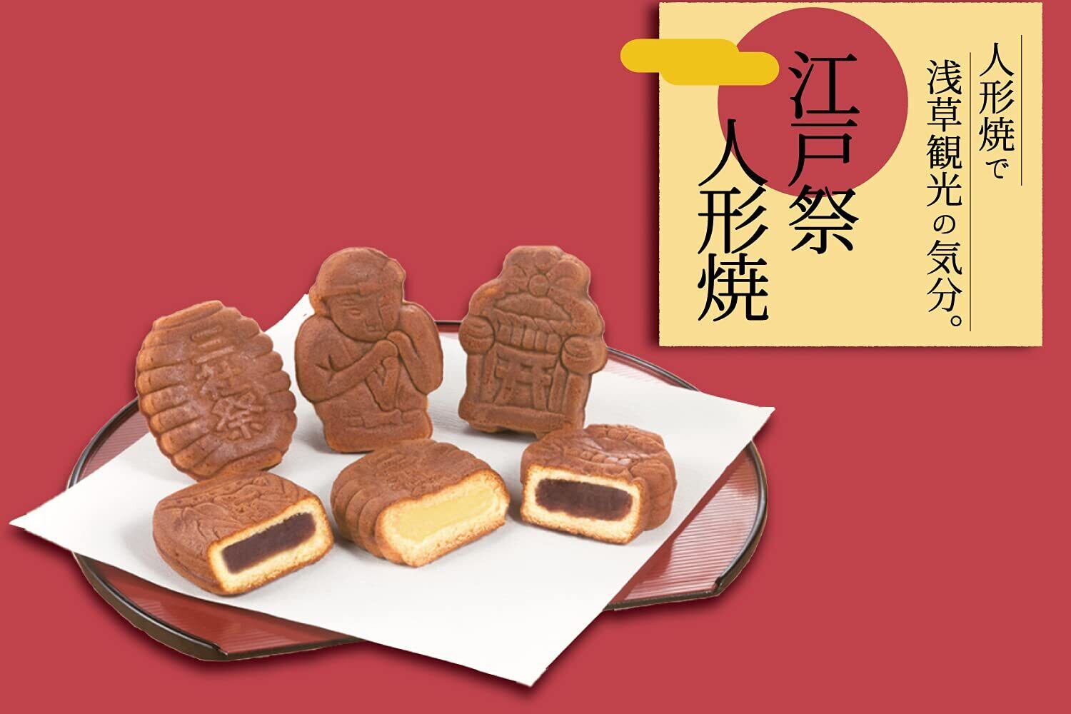 の代表商品。東京土産の大定番といえばやっぱり人形焼です。お祭りにちなんだ神輿、担ぎ手、太鼓、提灯の型がありとても楽しめる人形焼です。