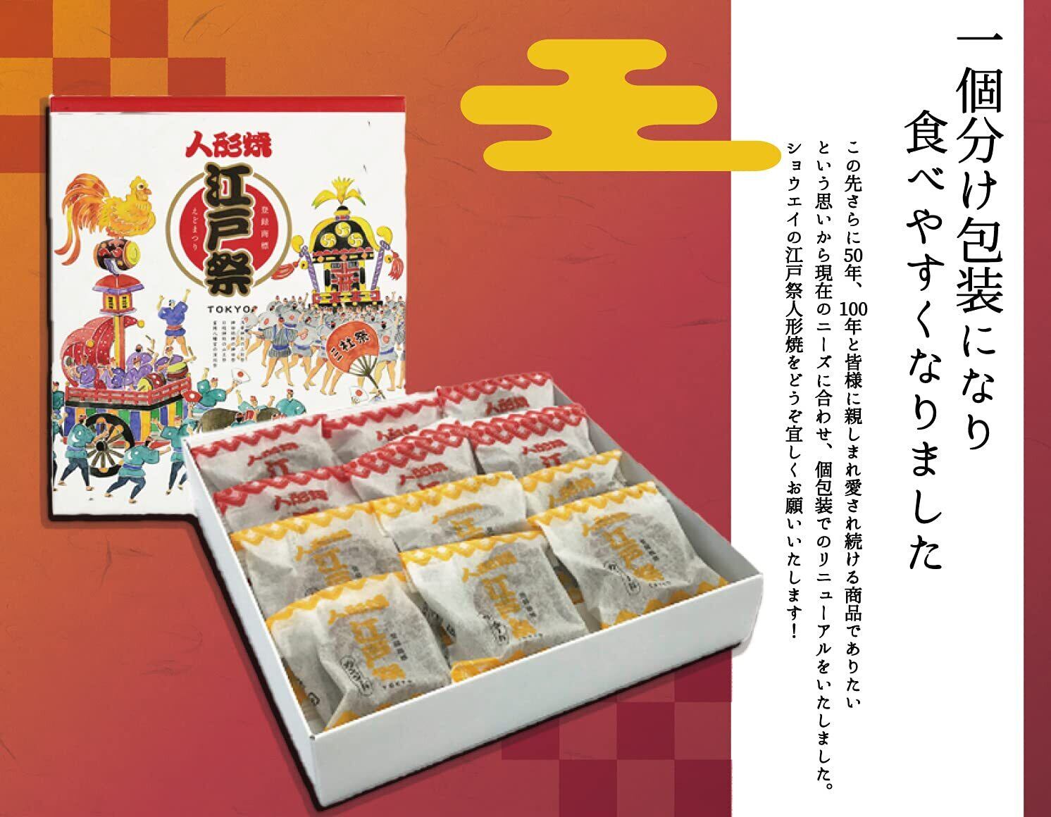 2種類の味が楽しめるお得な人形焼です。昨今、日持ちお菓子は一個分け包装での保存が主流となっております。江戸祭人形焼も昭和から平成そして令和の時代を迎え、この先さらに50年、100年と皆様に親しまれ愛され続ける商品でありたいという思いから現在のニーズに合わせ、リニューアルをいたしました。ショウエイの江戸祭人形焼をどうぞ宜しくお願いいたします!