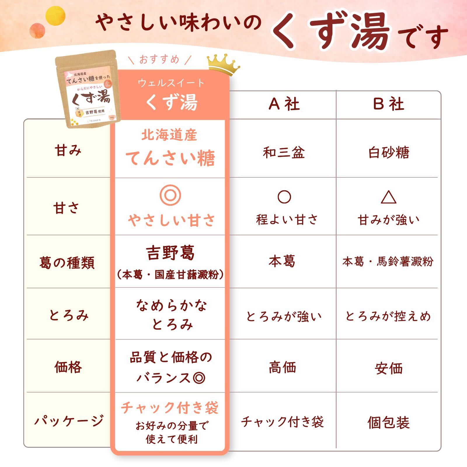 【白砂糖不使用】北海道産てんさい糖を使用し、やさしい甘さに仕上げました。従来のくず湯と比べて甘さ控えめなので、白砂糖特有の甘さが苦手な方にぴったりです。
