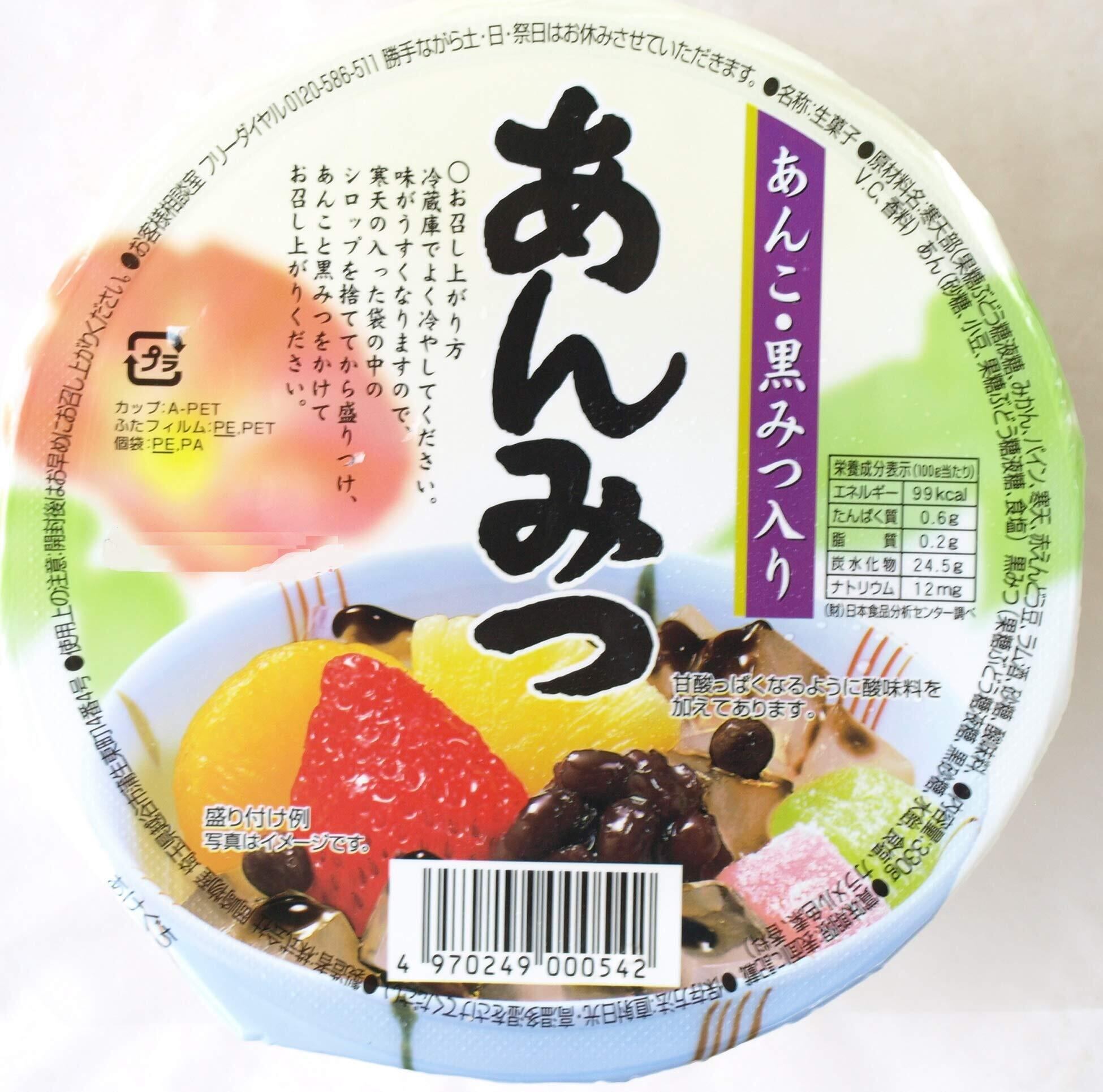 寒天部(果糖ぶどう糖液糖、みかん、パイン、寒天、赤えんどう豆、ラム酒、砂糖、酸味料、V.C、香料)あん(砂糖、小豆、果糖ぶどう糖液糖、食塩)黒みつ(果糖ぶどう糖液糖、黒砂糖、水飴、食塩、カラメル色素、香料)