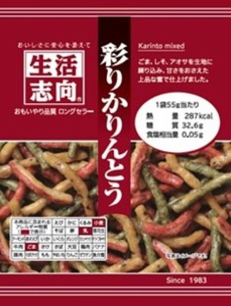 「『生活志向 彩りかりんとう』は、厳選された素材を使用した多彩なフレーバーのかりんとうです。55gのパッケージが16袋セットとなっており、ちょっとしたおやつやお茶うけにぴったりなサイズ。サクサクとした食感と、見た目にも楽しい色合いが特徴で、毎日のティータイムや友人との集まりに華を添えます。」