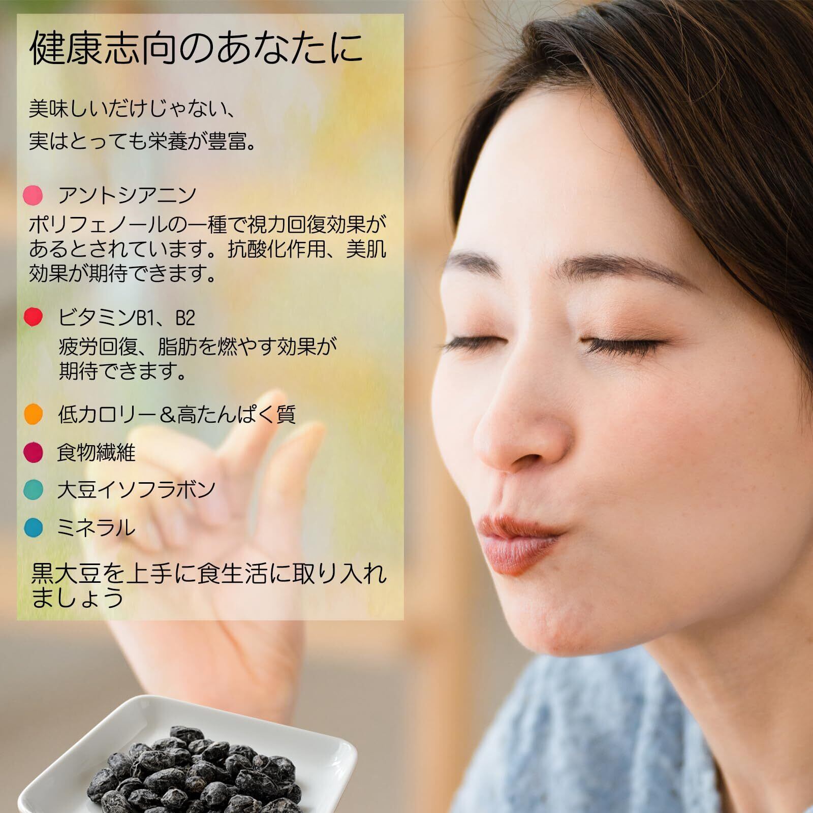 「この黒豆甘納豆は、食物繊維や高たんぱく質を豊富に含んでおり、健康を意識する方に最適です。おやつとしてそのまま楽しむのはもちろん、ヨーグルトやサラダにトッピングすることで、栄養価をさらにアップさせることもできます。」