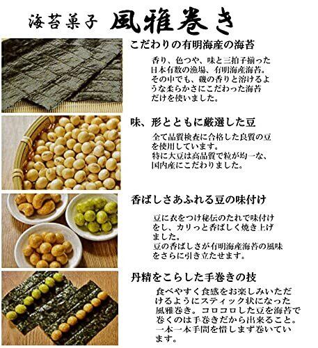 香ばしい国産海苔で包んだ豆菓子「風雅巻き」を5種類詰め合わせたセットです。醤油の旨味を生かした大豆やピーナッツ、香り豊かなわさび大豆、香ばしいカシューナッツなど、多彩な味をお楽しみいただけます。1本ずつ個包装されており、食べやすく衛生的で保存もしやすいため、ご家庭のおやつやおつまみ、来客時のお茶菓子としても便利です。上品な化粧箱入りで、お歳暮やお中元、手土産などのギフトにも適しています。内容量は21本(醤油大豆・醤油ピーナッツ 各3本×各2袋、わさび大豆・醤油カシューナッツ・塩ピーナッツ 各3本×各1袋)、箱サイズは約32.9×23×4.2cmです。保存は直射日光や高温多湿を避け、常温で行ってください。