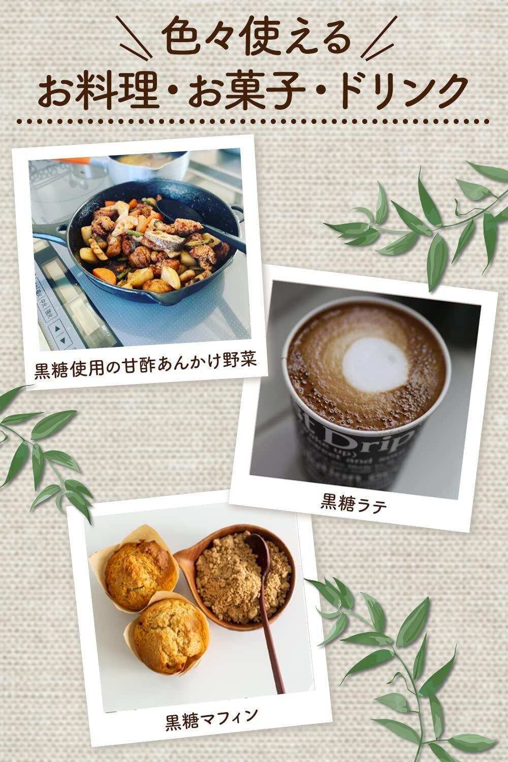 「この粉末黒糖は、サトウキビから作られた本物の黒糖で、穏やかな甘さと豊かな香りが魅力です。コーヒーや紅茶に加えることで、ほのかなアロマが広がります。また、お菓子作りや食材の隠し味としても活躍し、様々な料理に深みを与えます!」