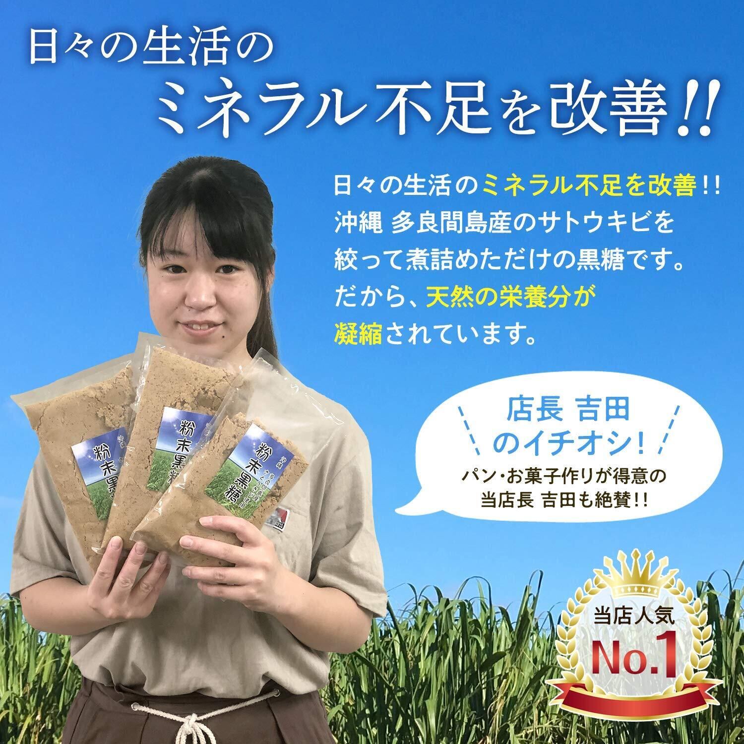「この粉末黒糖は、沖縄多良間島の豊かな自然環境で育まれたサトウキビを使用し、手間ひまかけて製造されています。香ばしさと深いコクがあり、焼き菓子やデザート、ホットドリンクなど幅広くお使いいただけます。健康にも気を使いたい方にぴったりの一品です!」