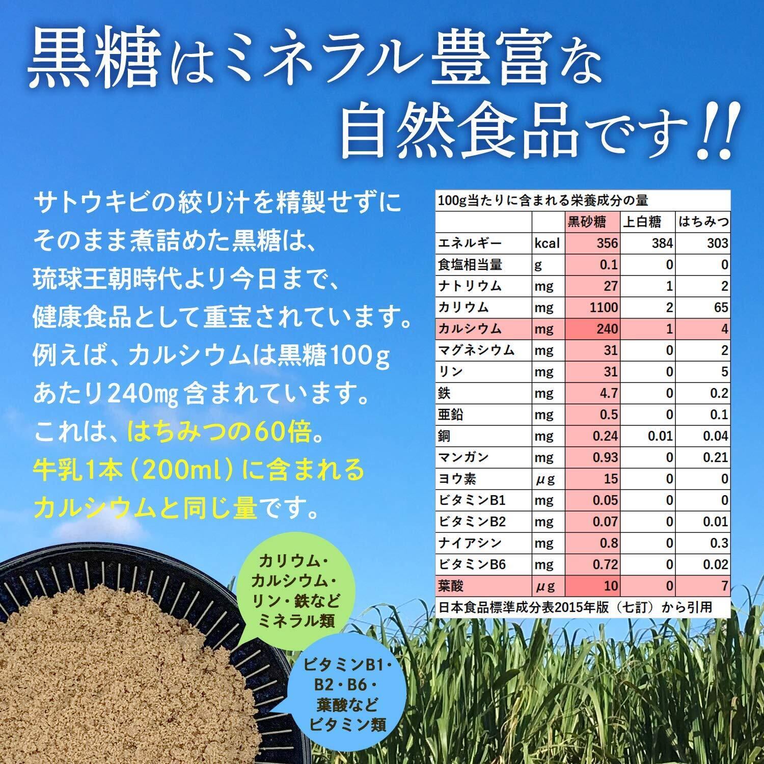 沖縄の黒糖は世界一と言われています。 サンサンとふりそそぐ太陽の光。 サンゴ礁に囲まれた島とミネラルを多く含んだ雨。 そんな自然の恵みをたっぷり含んだサトウキビから。 栄養豊富な黒糖が作られます。 サトウキビの絞り汁を精製せずにそのまま煮詰めた黒糖は、 琉球王朝時代より今日まで、健康食品として重宝されています。 例えば、カルシウムは黒糖100gあたり240㎎含まれています。 これは、はちみつの60倍です。 牛乳1本(200ml)に含まれるカルシウムと同じ量です。