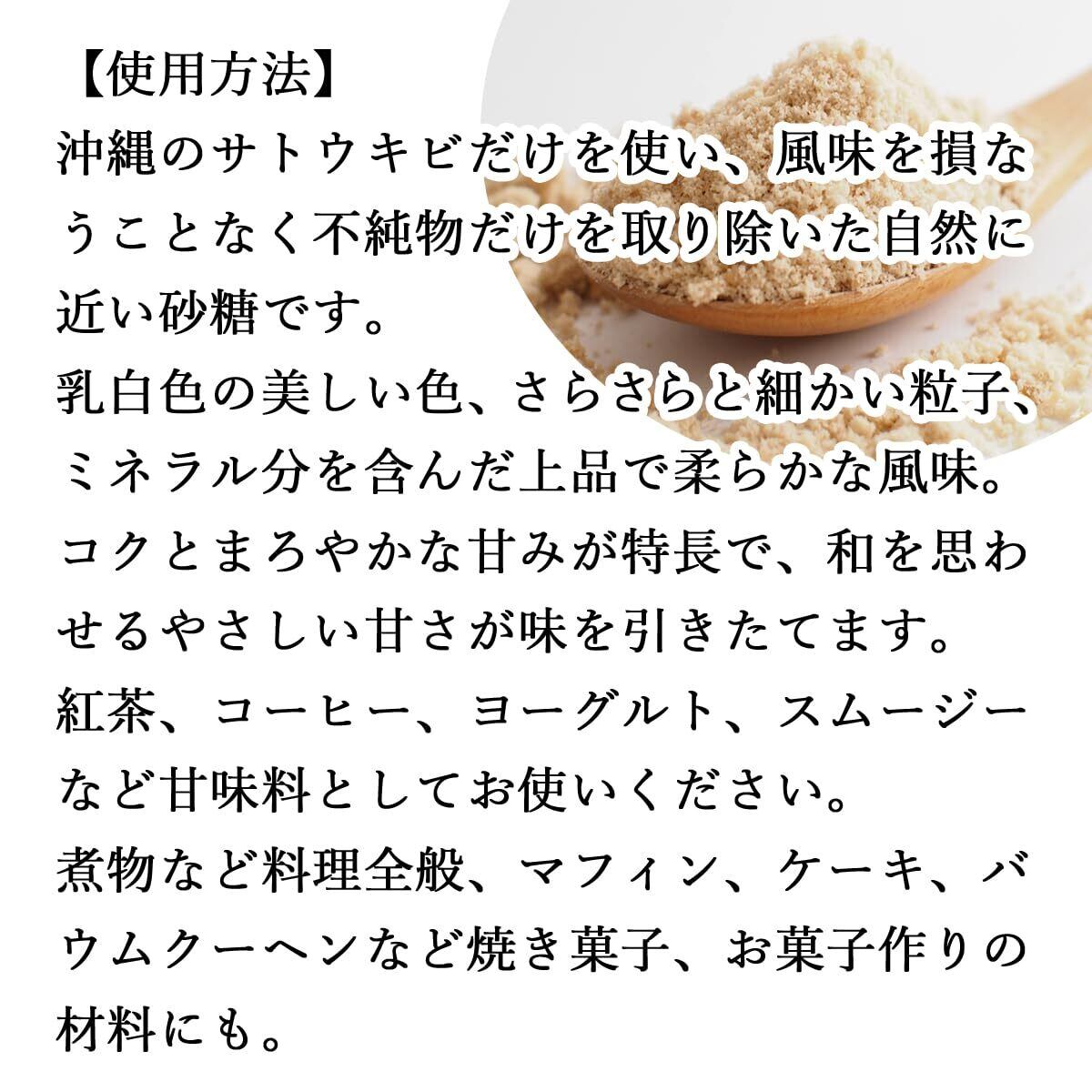 【使い方】国産(沖縄産)のサトウキビだけを使い、風味を損なうことなく自然に近い砂糖を作りました。乳白色の美しい色、さらさらと細かい粒子、ミネラル分を含んだ上品で柔らかな風味。コクとまろやかな甘みが特長で、和の香りが料理の味を引きたてます。紅茶、コーヒー、ヨーグルト、スムージーなど甘味料としてお使いください。バウムクーヘン、マフィン、パンケーキ、ロールケーキ、クッキー、蒸しパンなど製菓材料に。煮物など料理全般にもおすすめです。