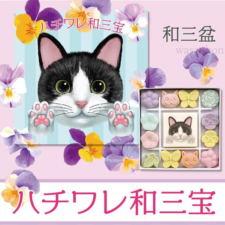 「この和三宝は、愛らしいハチワレ猫をかたどっており、見た目にも楽しいデザインが特徴です。色とりどりの猫たちは、特別な日やお祝いの席でも注目を集めることでしょう。一口ごとに広がる甘さが、心を穏やかにしてくれます。」