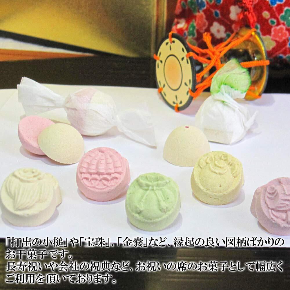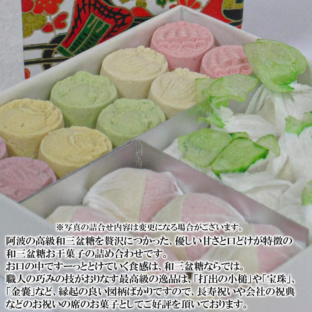 「この宝づくしのお干菓子は、季節感を意識したデザインが施されており、目でも楽しむことができます。和三盆糖の滑らかな口当たりと、上品な甘さが穏やかなひとときを演出します。お祝いの席や特別な日にもぴったりです。」