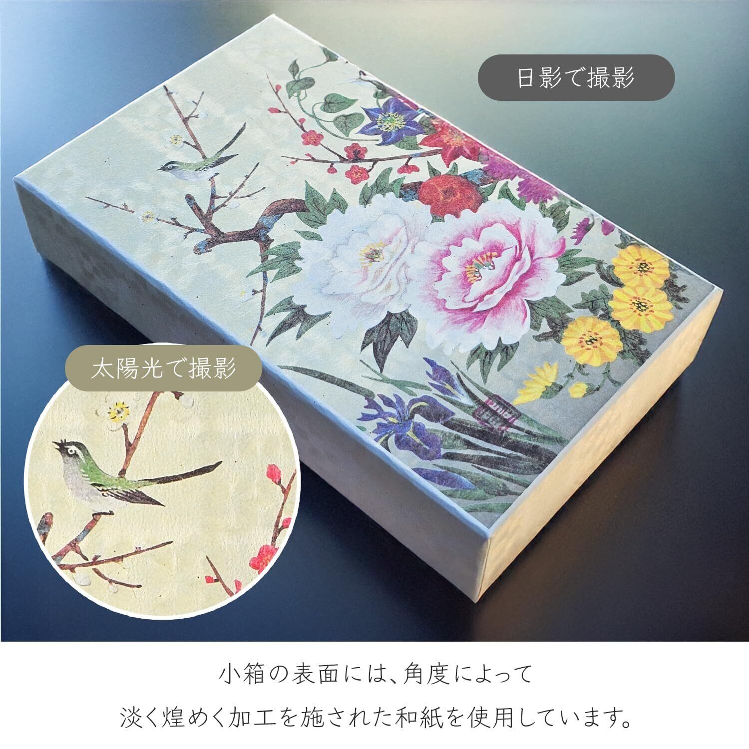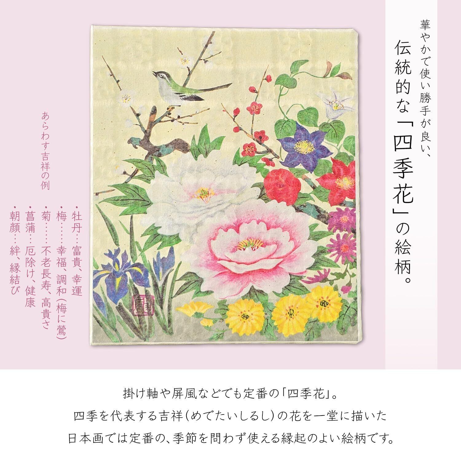 蓋には掛け軸でも人気の「四季花」の絵柄があしらわれています。四季花とは、花の王様といわれる牡丹を中心に、春夏秋冬の代表的な吉祥の花を一堂に描いた日本画です。華やかで縁起がいい絵柄ですので、季節を問わずギフトにご利用いただけます。