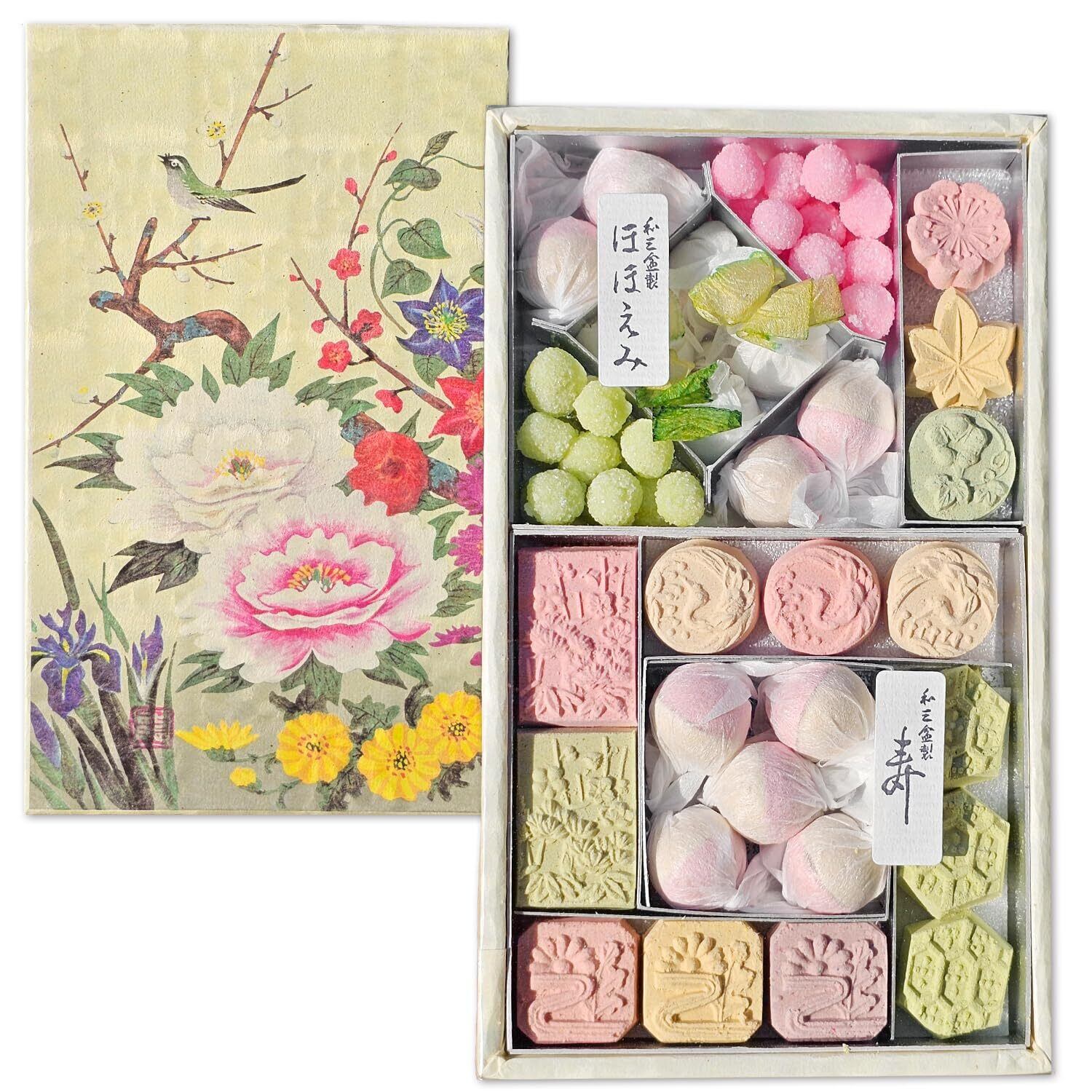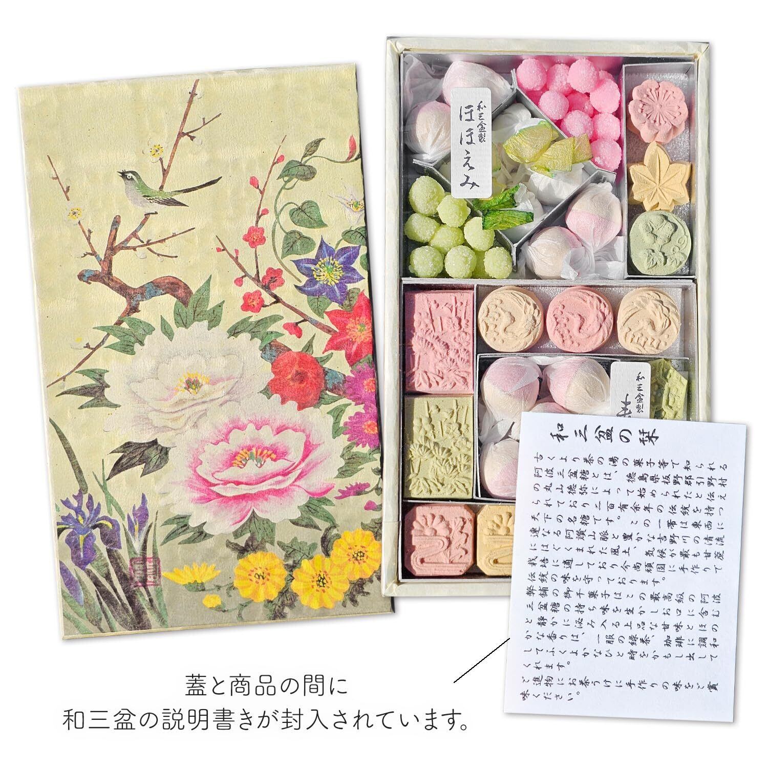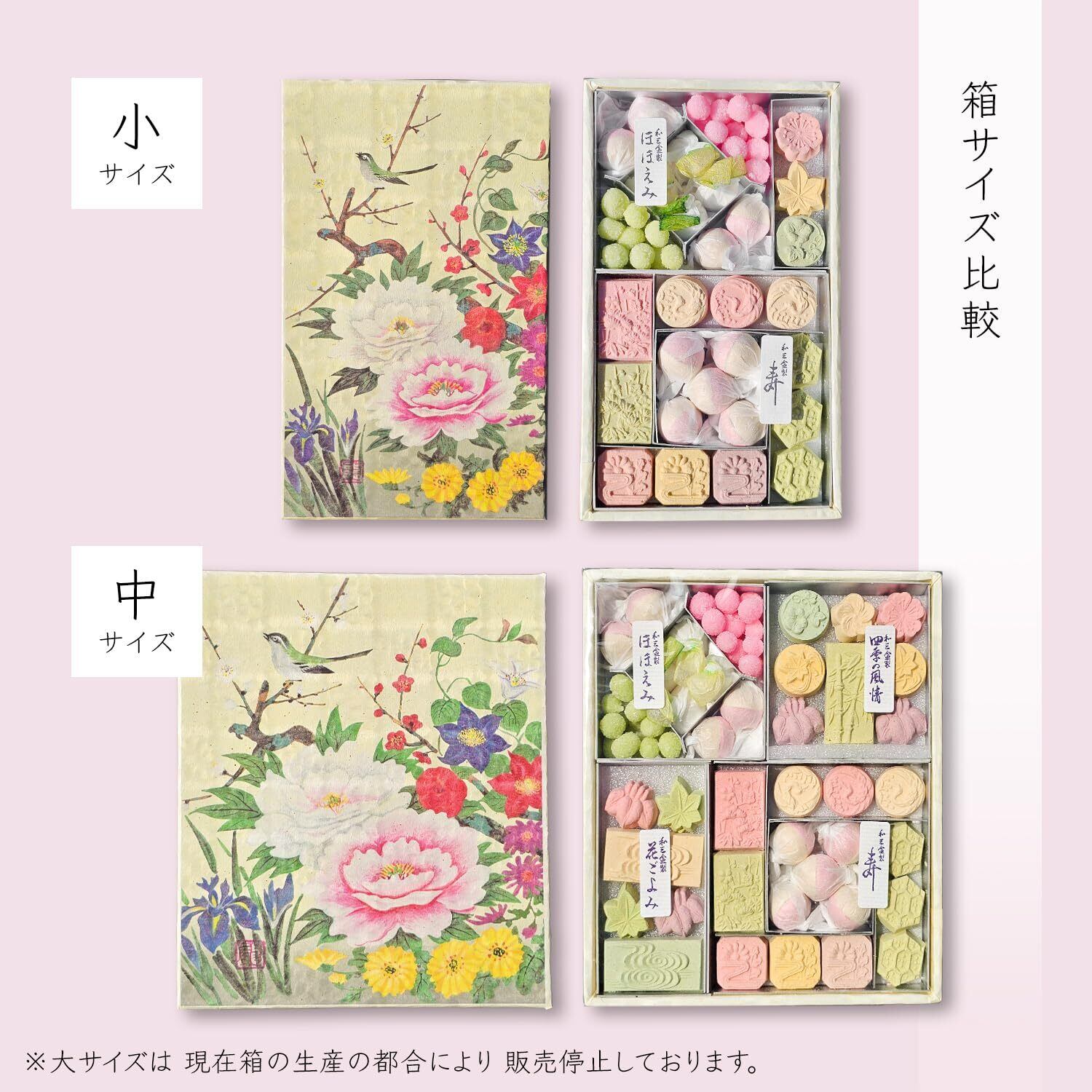 徳島県産和三盆糖を使用した、特別な御干菓子の小箱「ほほえみ」と「寿」(中サイズは更に「四季の風情」、「花ごよみ」)が1つになった豪華なセットです。 蓋には掛け軸でも人気の「四季花」の絵柄があしらわれています。 四季花とは、花の王様といわれる牡丹を中心に、春夏秋冬の代表的な吉祥の花を一堂に描いた日本画です。 華やかで縁起がいい絵柄ですので、季節を問わずギフトにご利用いただけます。 箱サイズ:17×10×3cm ※絵柄付きの和三は、2段になっています。お菓子の下にもう1段ございますので、お気を付けください。 古来から大切にされてきた幸せを運ぶ和三盆糖。 和三盆糖は細やかな柄も表現できるほどなめらかな見目と、 黒糖のような風味、すっとほどける優しい口どけが特徴です。 「ほほえみ」の小箱の中にある ピンクと緑の丸いお菓子は、梅菓子です。乾燥させた梅を使用しています。 和紙のひねり包みがされたお菓子は、半球の形をした和三盆糖御干菓子です。「千代の契り」などの中身と同じものです。