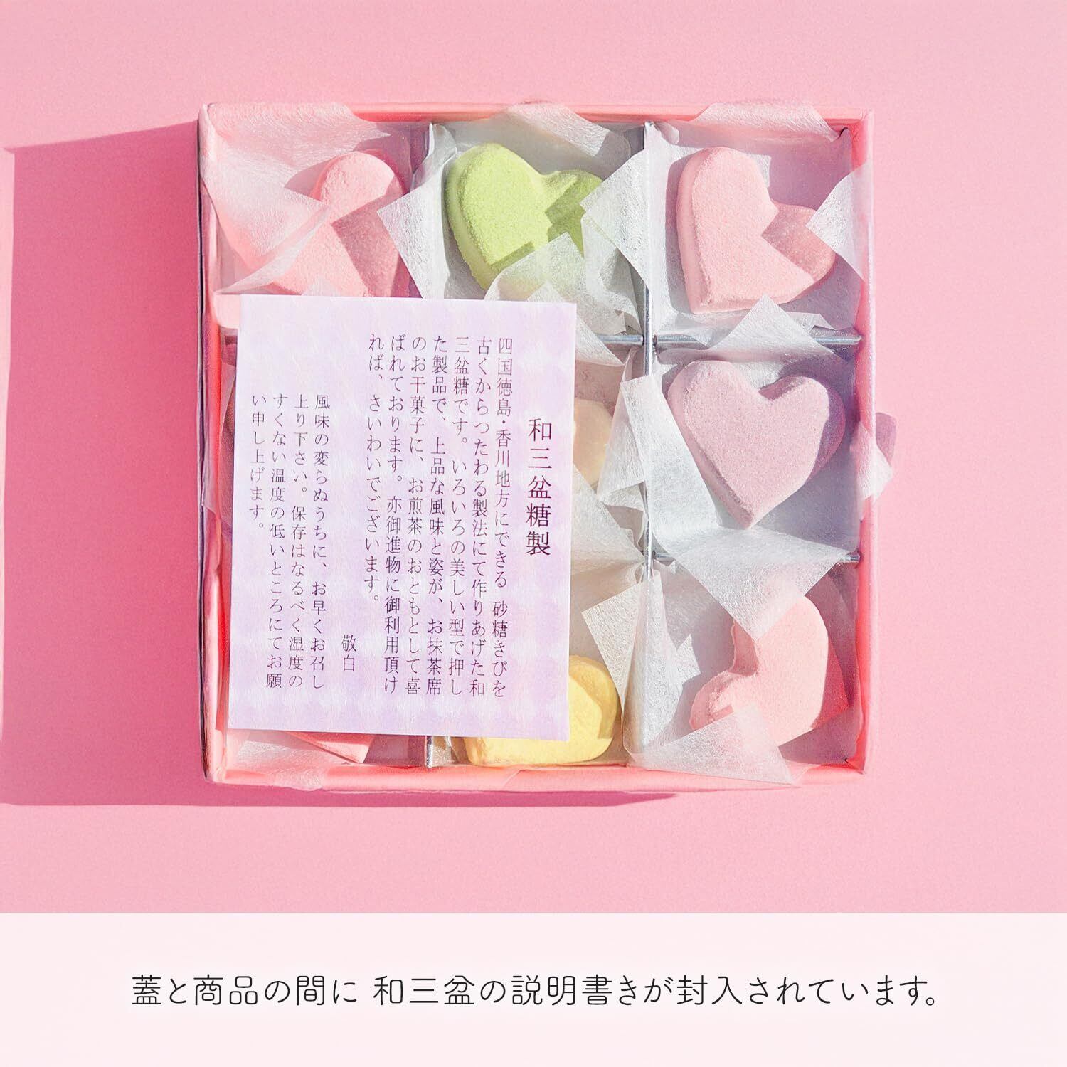 カラフルなハートの かわいらしい見た目と、日本の伝統的な和三盆糖お干菓子の組み合わせは、様々なシーンで「ちょうどいい」一品。
