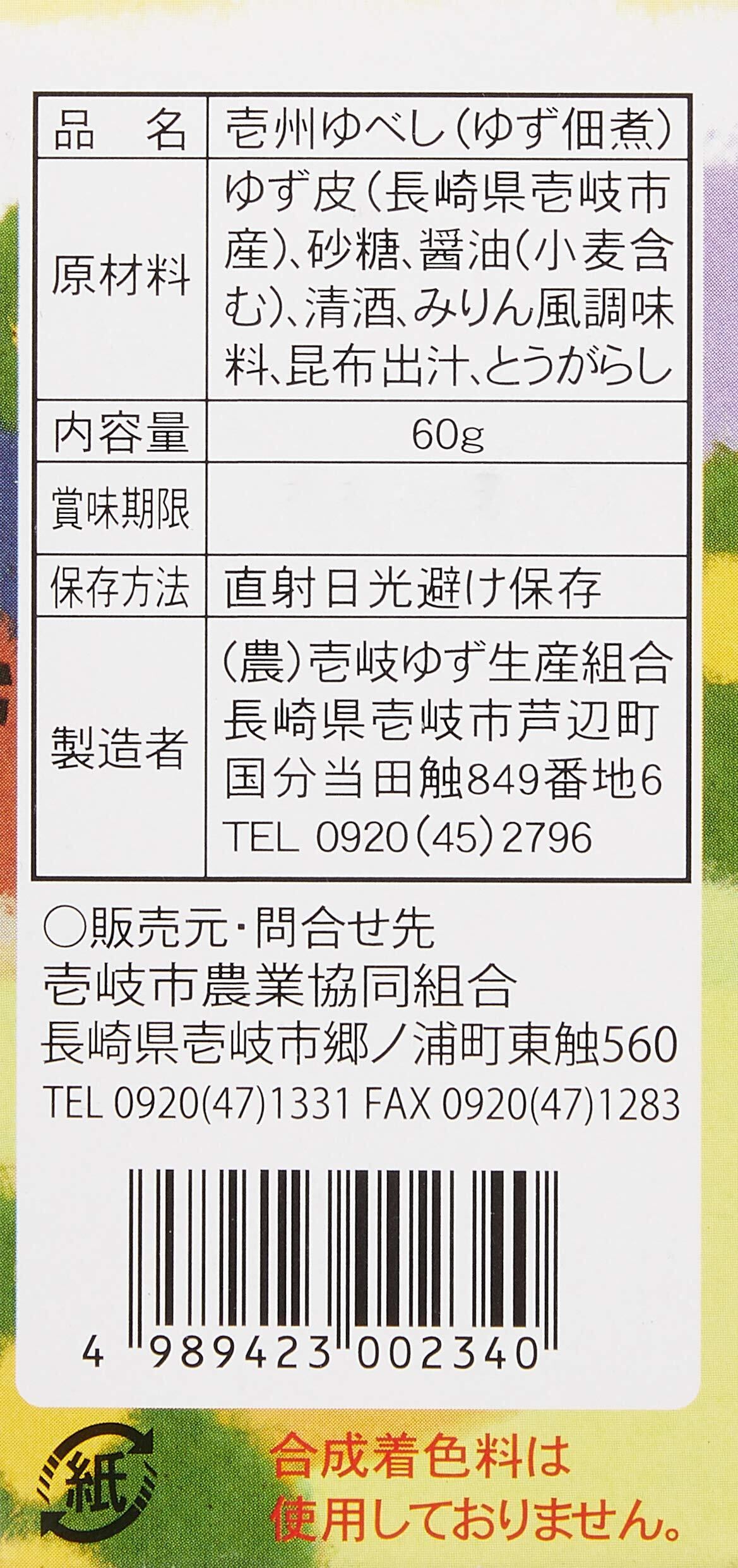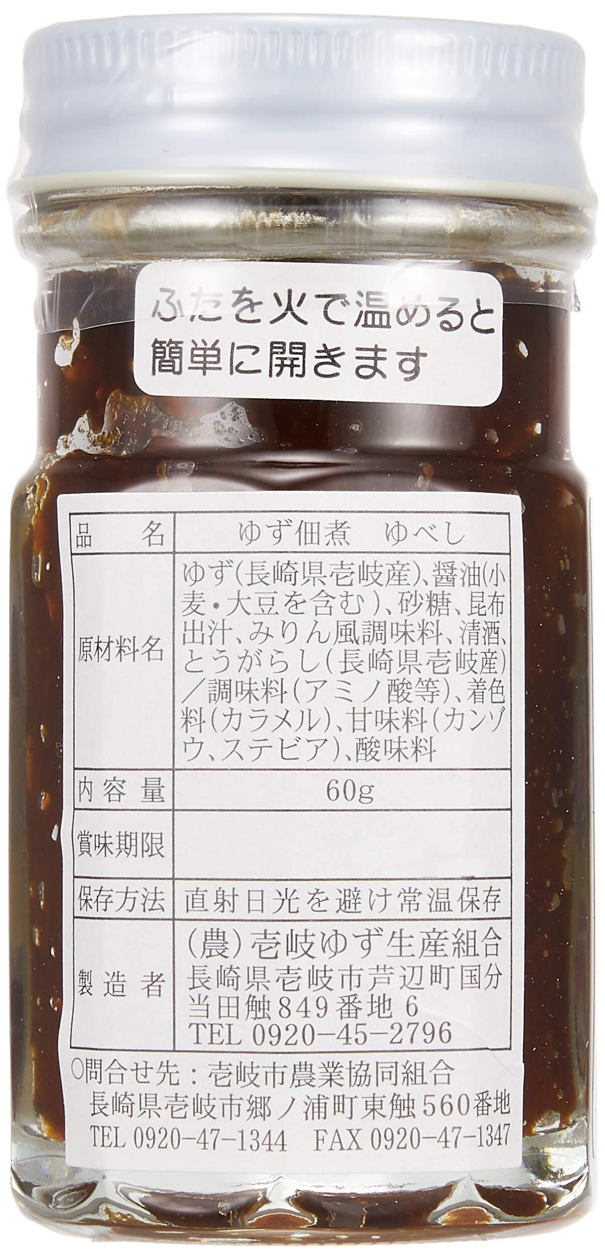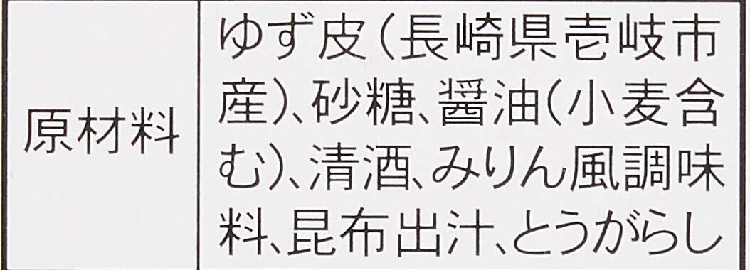 原材料:ゆず(長崎県壱岐産)、砂糖、醤油(小麦含む)、清酒、みりん風調味料、昆布出汁、とうがらし