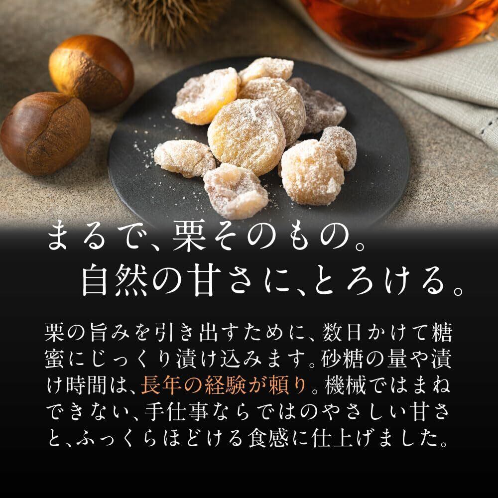 「このマロングラッセは、上質な栗を砂糖でじっくりと煮て作られており、独特の風味と甘さが口いっぱいに広がります。お茶うけやデザートとして楽しむのはもちろん、ワインとの組み合わせもおすすめです。ひと口食べると、栗の香ばしさと甘さで心が癒されます。」