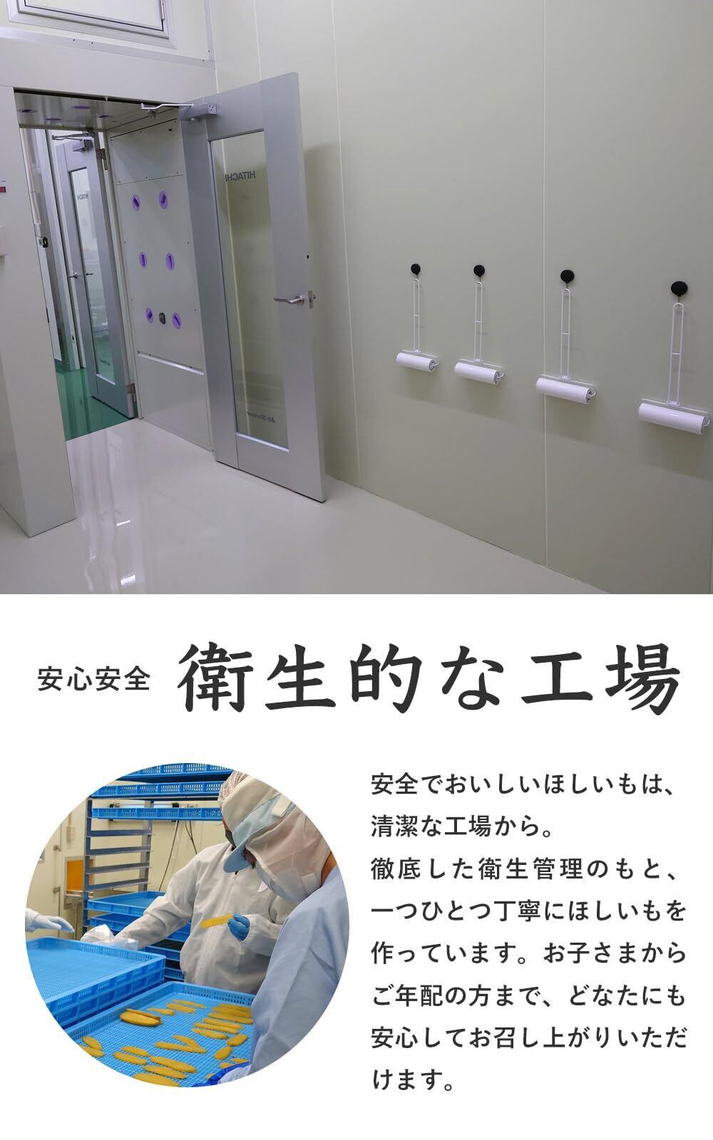 【衛生的な工場】安全で美味しい干し芋は、清潔な工場から。徹底した衛生管理のもと、一つひとつ丁寧に干し芋を作っています。お子さまからご年配の方まで、どなたにも安心してお召し上がりいただけます。